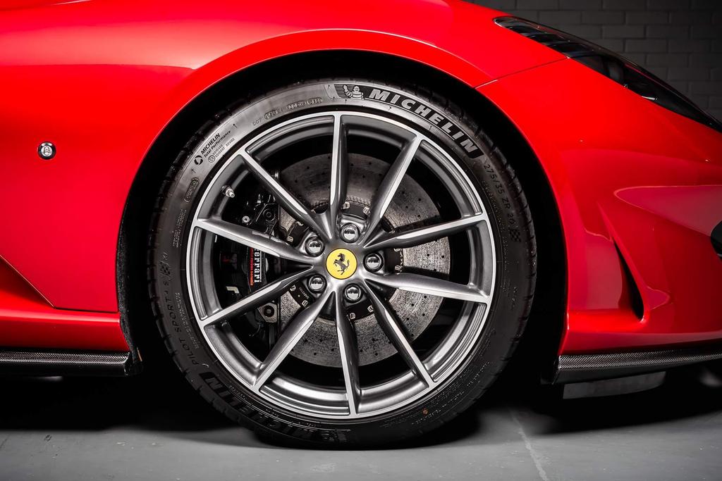 - Exterior: Striking Rosso Fuoco finish enhanced by carbon fiber accents, including front bumper, rear diffuser, and under-door trim. Features “Scuderia Ferrari” fender shields, 20-inch forged wheels with a diamond-polished anthracite finish, and a retractable hard top.