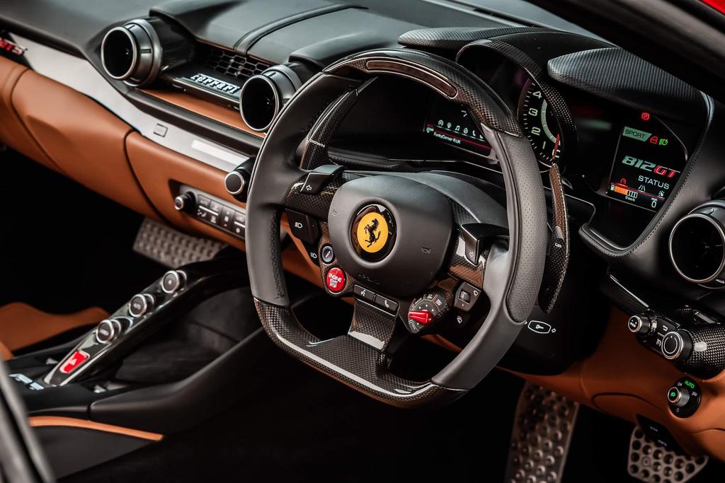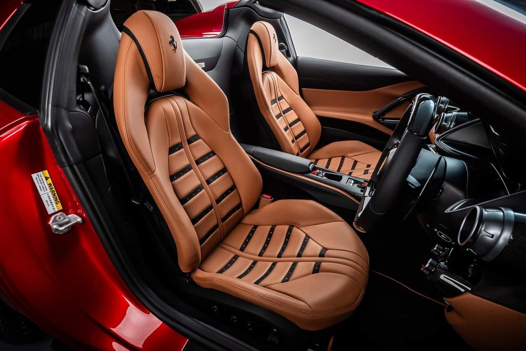 - Interior: Luxurious Cuoio leather with contrasting black stitching, “Daytona” style seats, embroidered Cavallino logos on headrests, and carbon fiber inserts throughout, including the driver zone and center console.