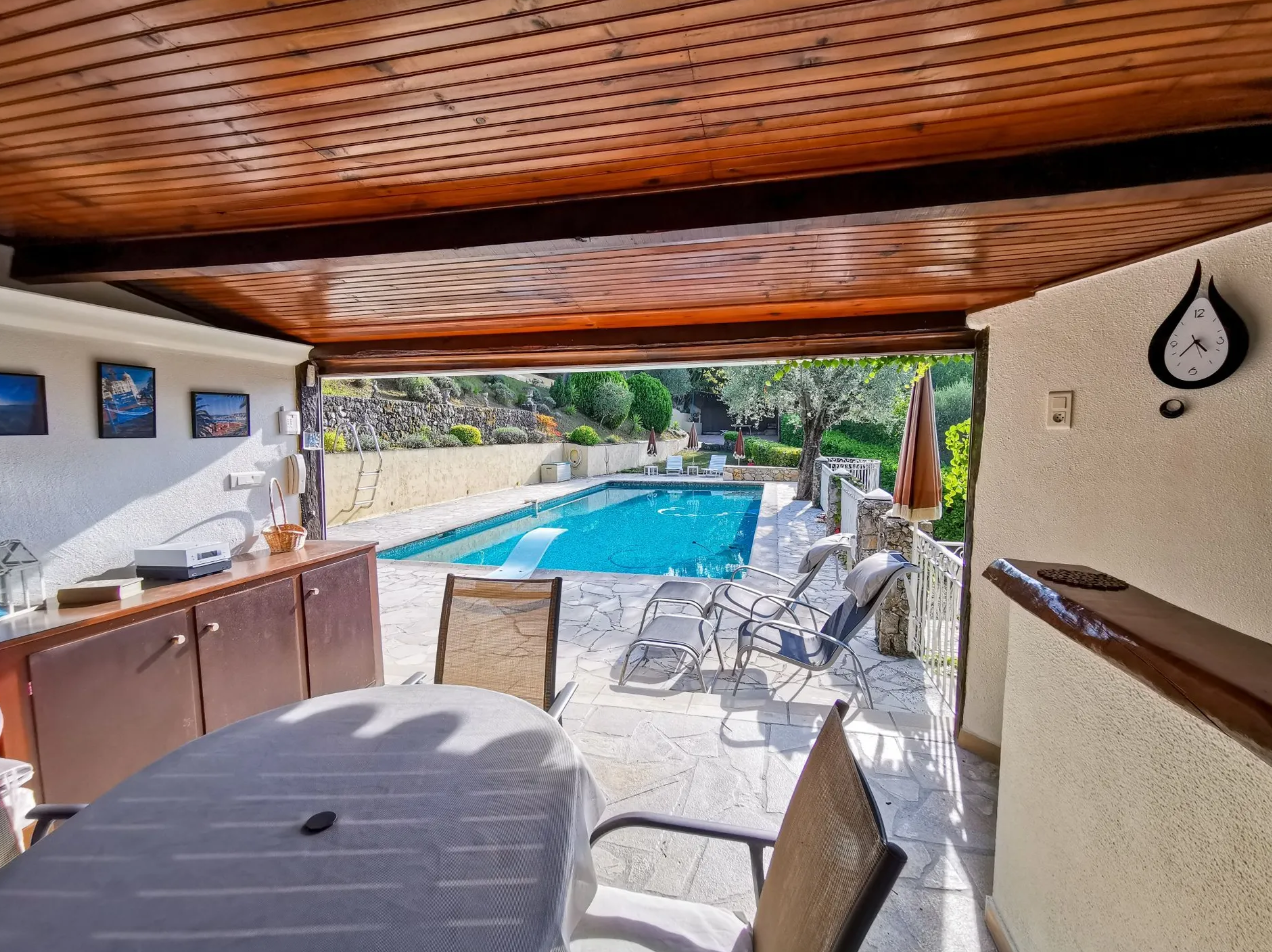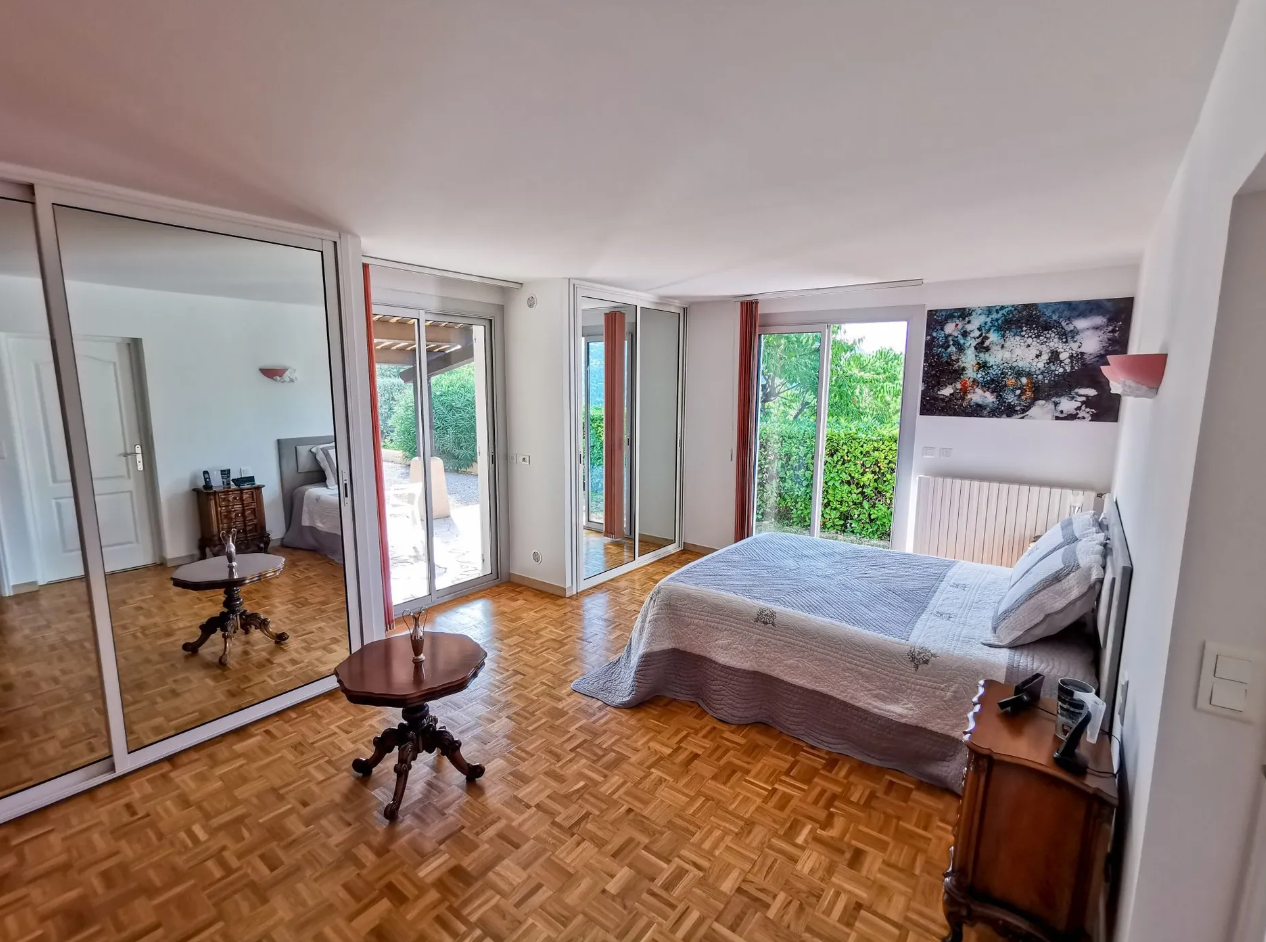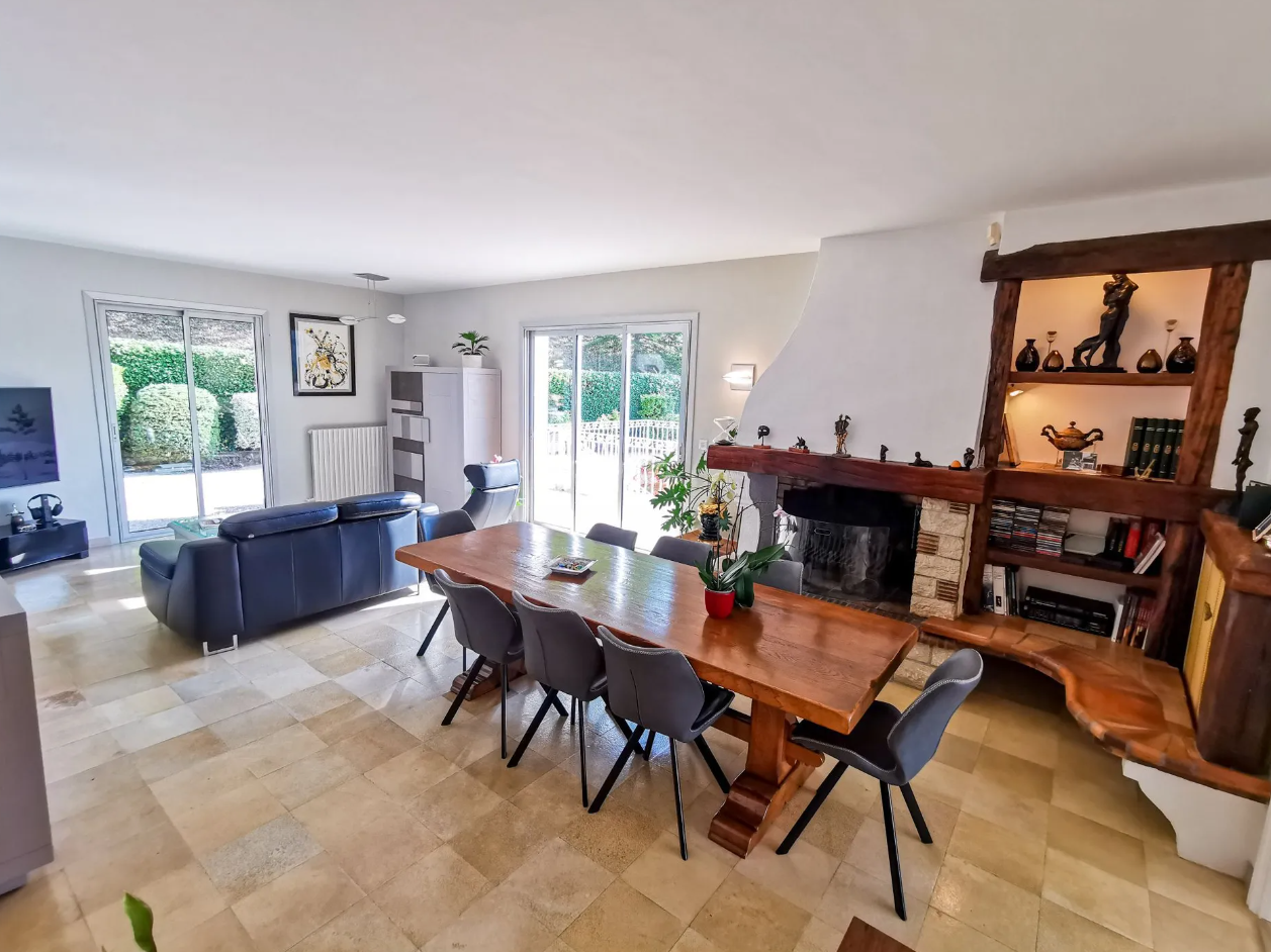 This stunning villa, set on a 5,600 sqm plot, offers a spacious 225 sqm living area spread over two levels. Located in a peaceful, green setting, it features a large swimming pool, outbuildings, and ample parking, perfect for both relaxation and entertainment.