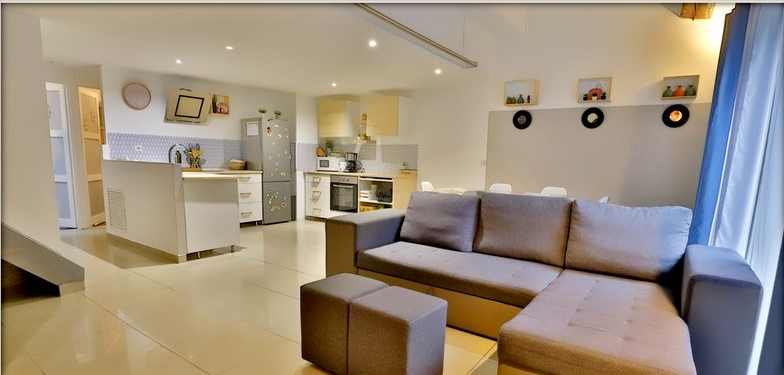 - Spacious Living Area – Open-plan design with a bright living room, exposed stone walls, and a modern fitted kitchen with ample counter space.