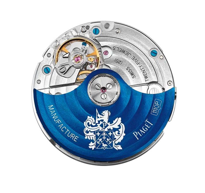 - Crystal: Sapphire crystal case-back showcasing the blue oscillating weight engraved with the Piaget coat-of-arms