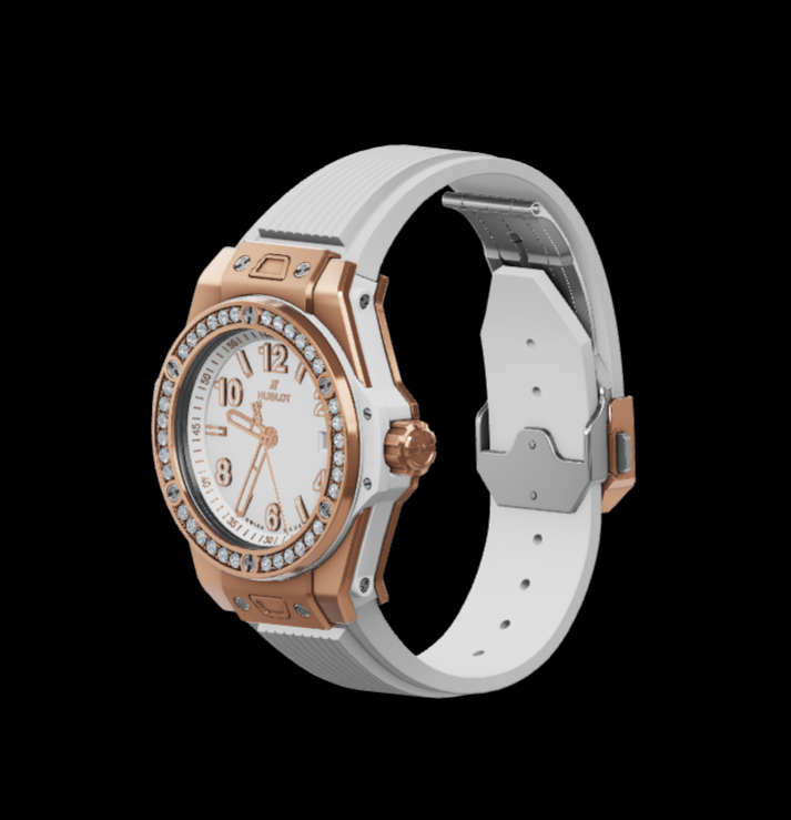 - Strap: White structured lined rubber, combining elegance with durability.