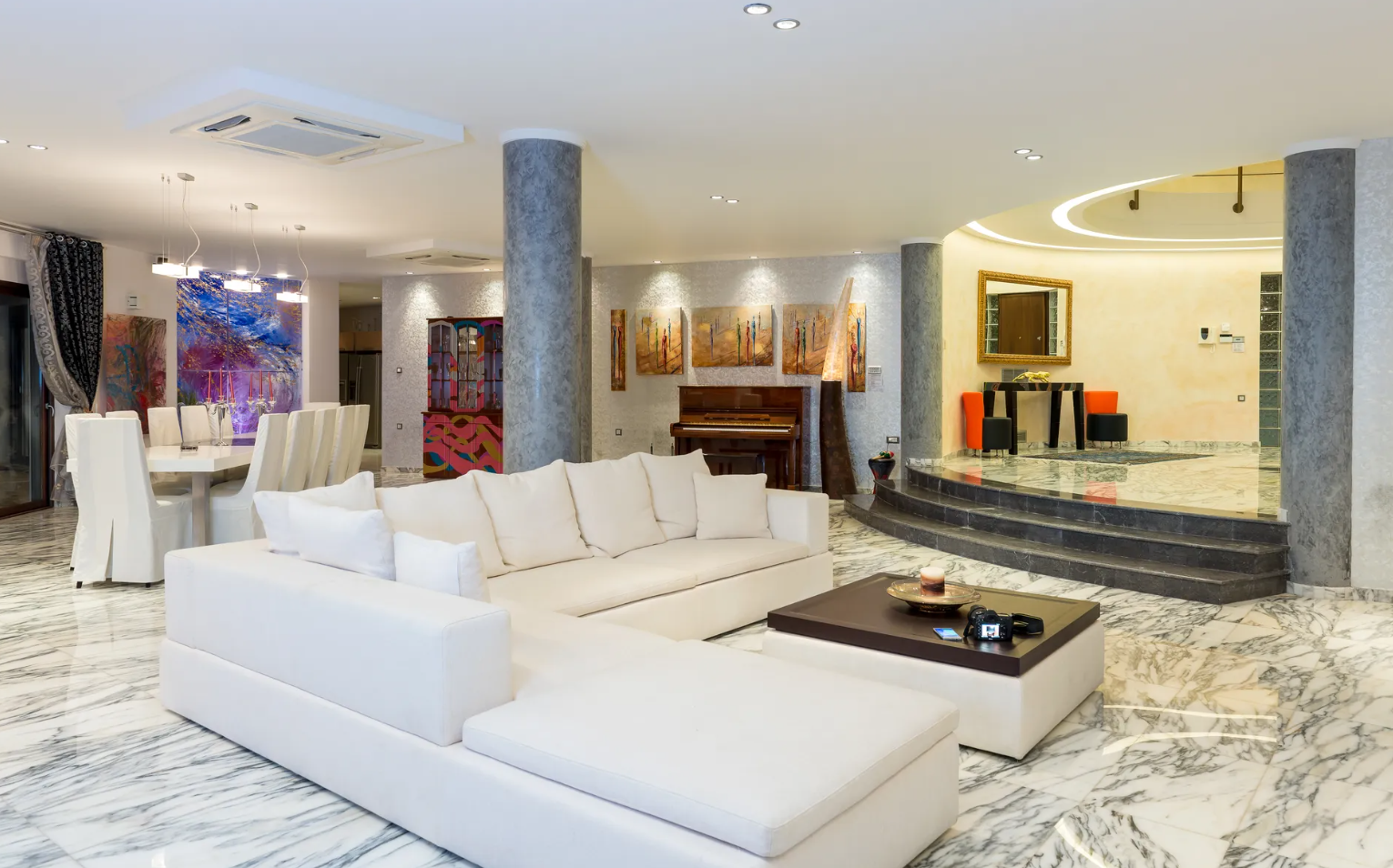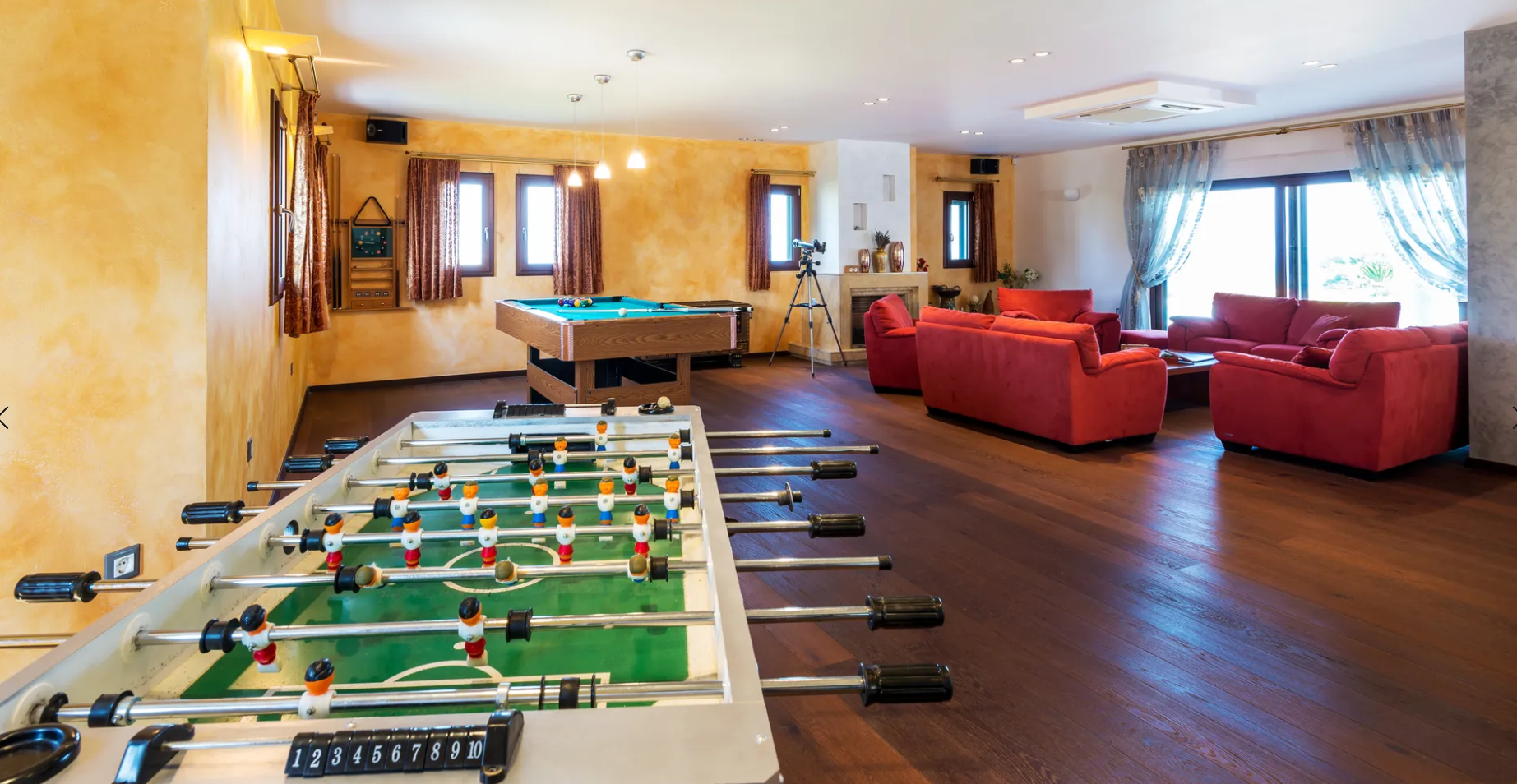 - Open-plan living, dining, billiards, and TV area.