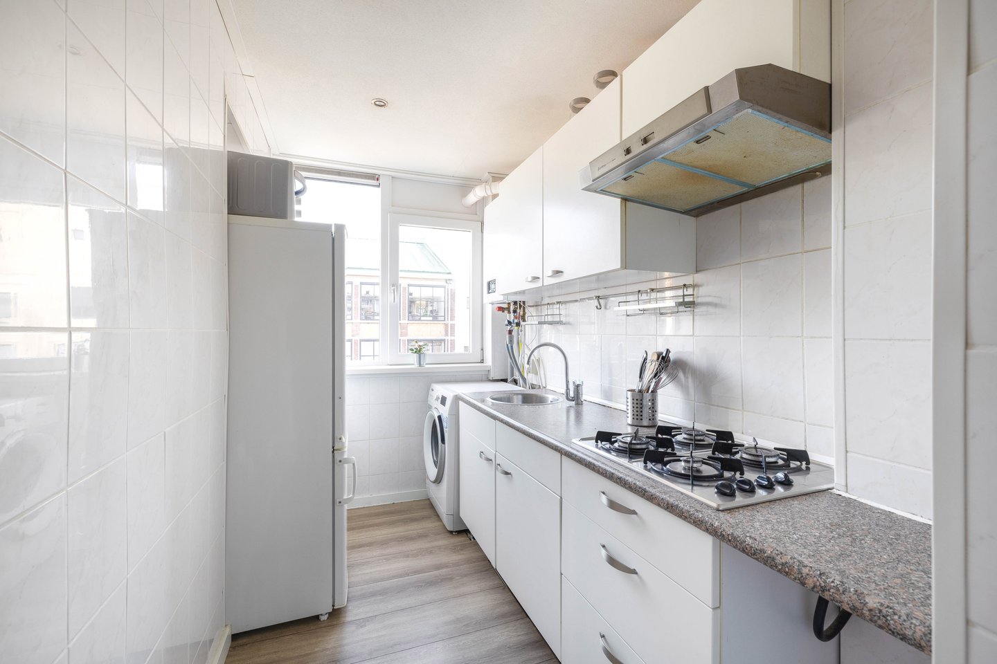 • Kitchen: Equipped with a gas stove and washing machine connection