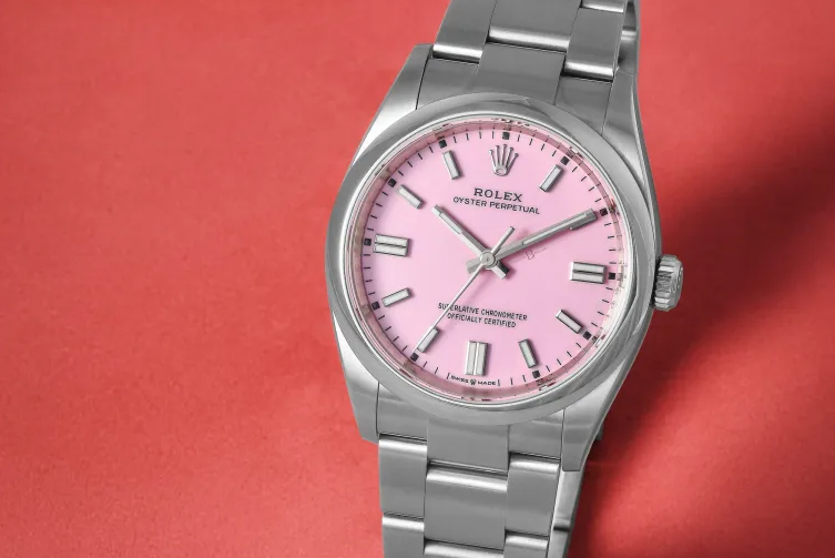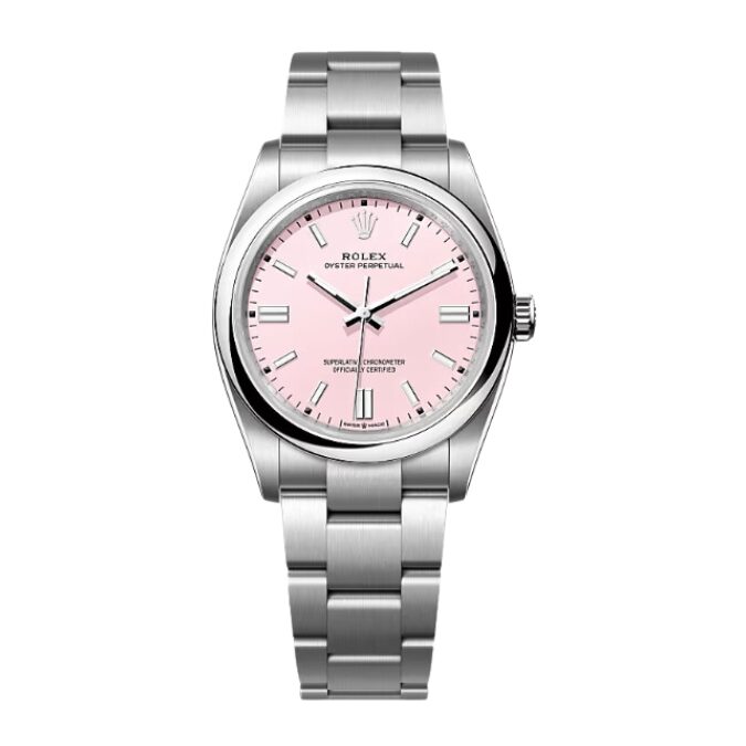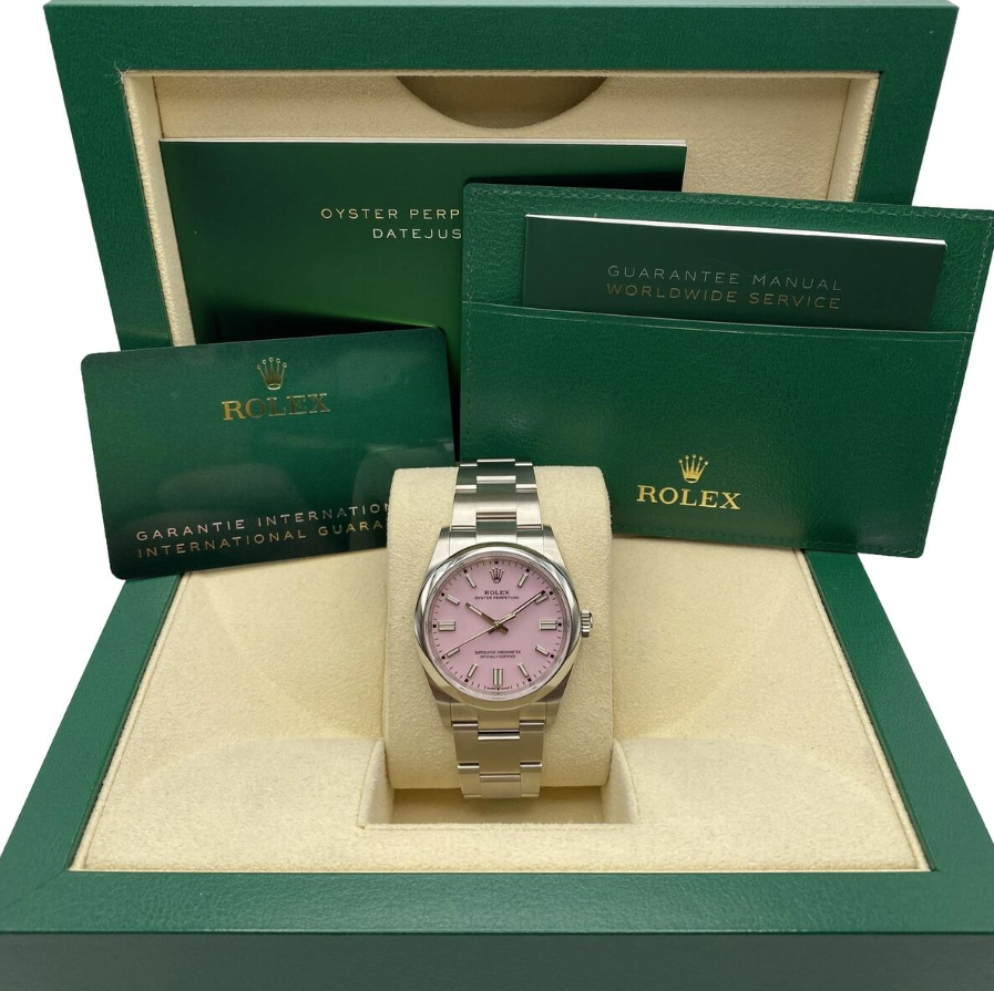 With its bold pink dial and refined craftsmanship, the Rolex Oyster Perpetual 36 is a striking timepiece that perfectly balances modern aesthetics with Rolex’s legendary reliability. Whether for casual wear or formal occasions, this watch is an iconic addition to any collection.
