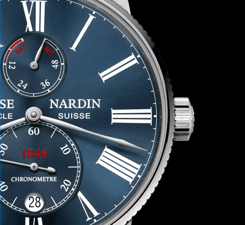 - Dial: Blue with Roman numerals, classic marine chronometer aesthetic