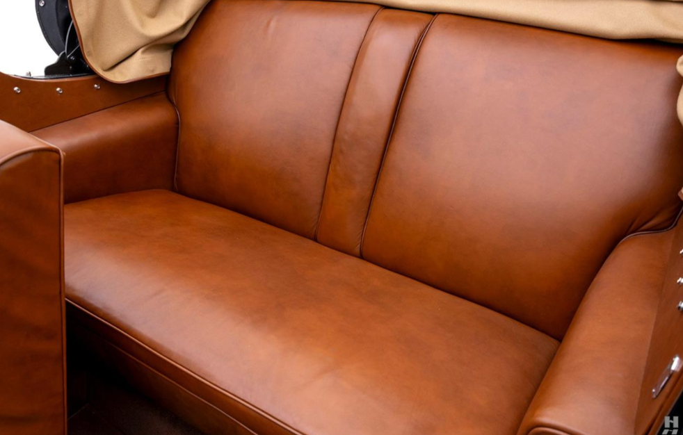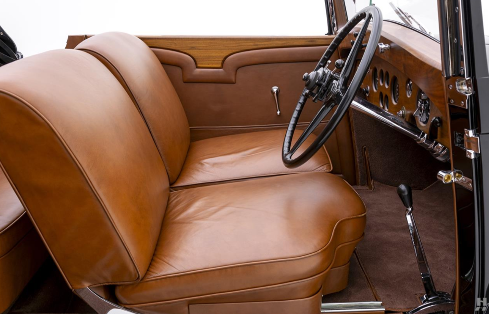 - Interior: Restored elegant tan leather interior with walnut wood trim and polished metal accents