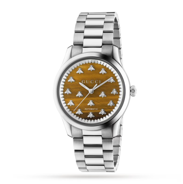 The Gucci G-Timeless YA1264177 boasts a 38mm stainless steel case, brown tiger eye stone dial with signature bee motifs, automatic Swiss movement, 5 ATM water resistance, and an adjustable steel bracelet. Combining natural elegance with precision craftsmanship.