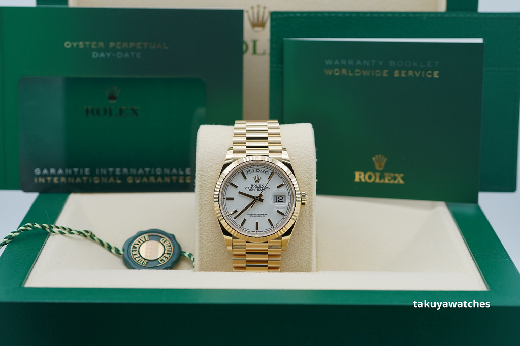 The Rolex Day-Date 36 Ref. 128238 blends heritage with modern technology, delivering unmatched precision and sophistication. The white lacquer dial, complemented by the fluted bezel and yellow gold President bracelet, makes this timepiece an enduring symbol of luxury and prestige.