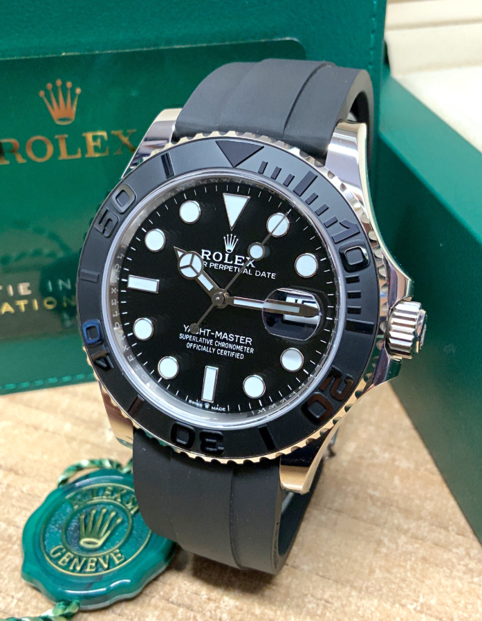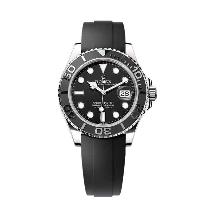 The Rolex Yacht-Master 42 offers a sophisticated yet sporty design with its 42mm Oyster case in 18kt white gold. The black dial and innovative Oysterflex bracelet combine elegance and durability for a high-performance watch that excels in both style and function.