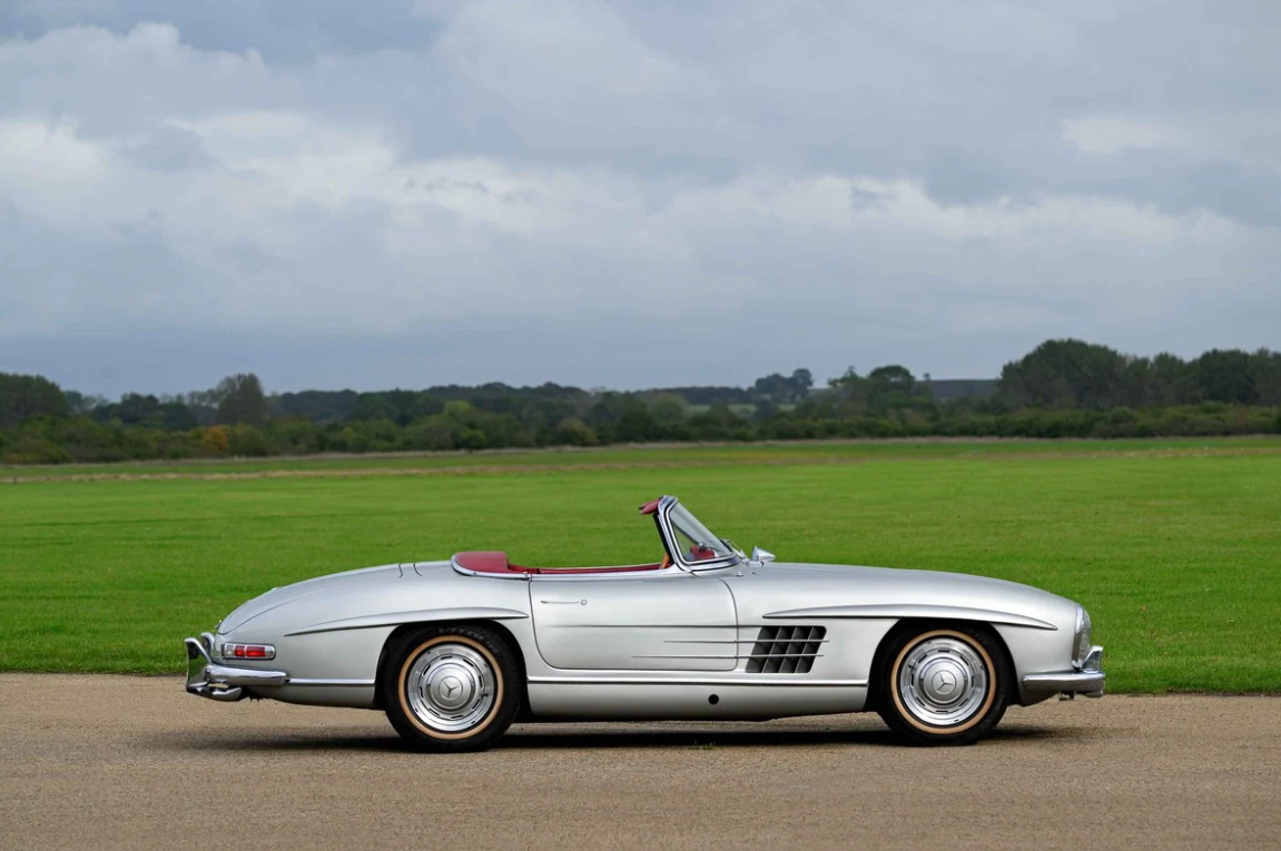 A stunning 1957 Mercedes Benz 300SL Roadster with a 3.0L engine, manual transmission, original silver-grey paint, and red leather interior. Impeccable condition, well-documented history, and advanced features for exceptional performance and touring comfort.