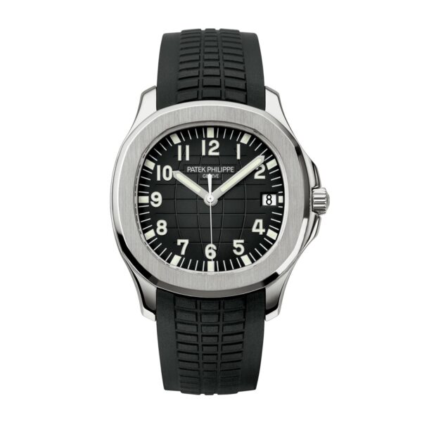 The Patek Philippe 5167A Aquanaut features a 40.8mm stainless steel case, black embossed dial, and a durable black tropical composite strap. Powered by a self-winding Caliber 26-330 S C movement, it’s water-resistant to 30m with a sapphire crystal case back.