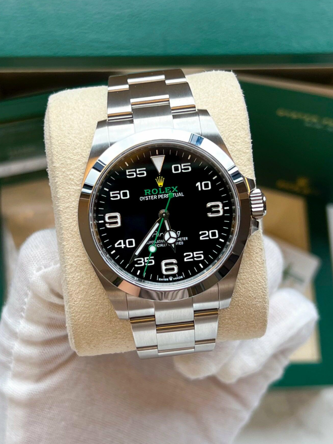 The Rolex Air-King 40 mm is a tribute to aviation pioneers, blending Rolex’s signature durability with a design inspired by cockpit instruments. Featuring a bold black dial with distinctive numerals and a high-precision Calibre 3230 movement, this model is built for those who appreciate history, engineering, and elegance.