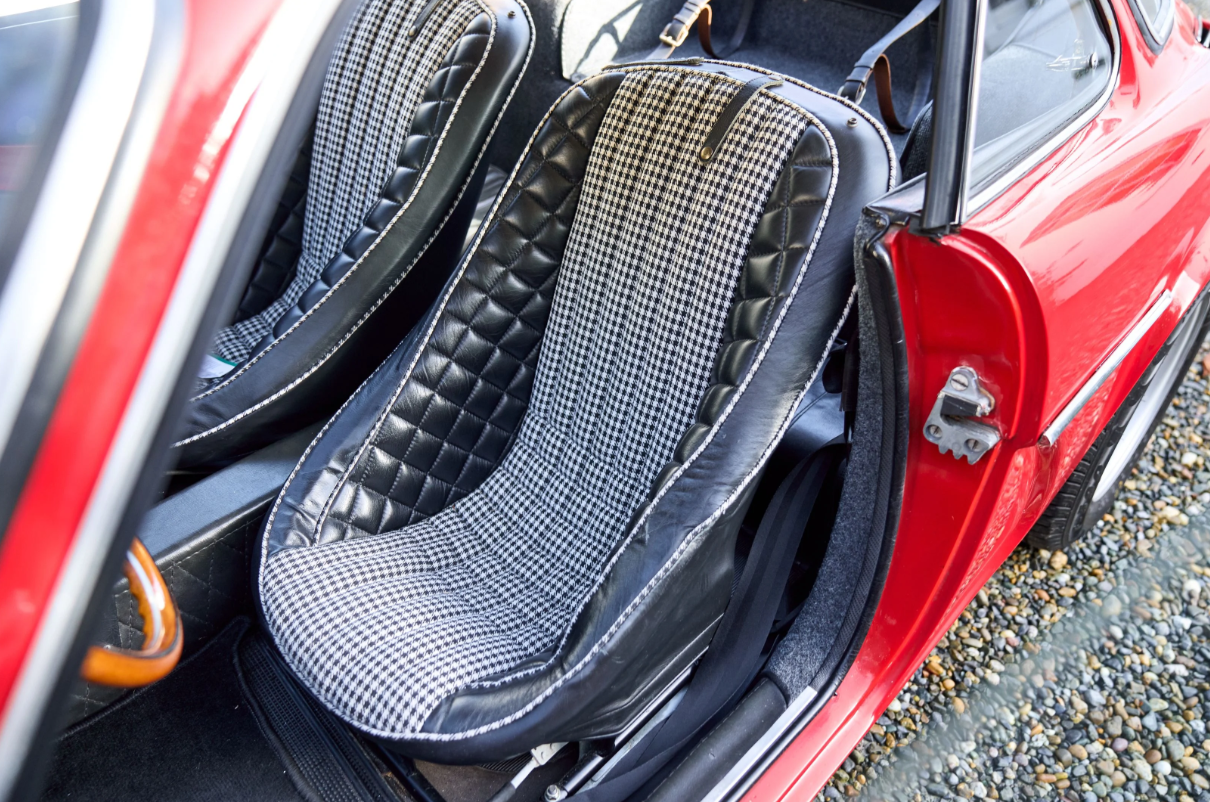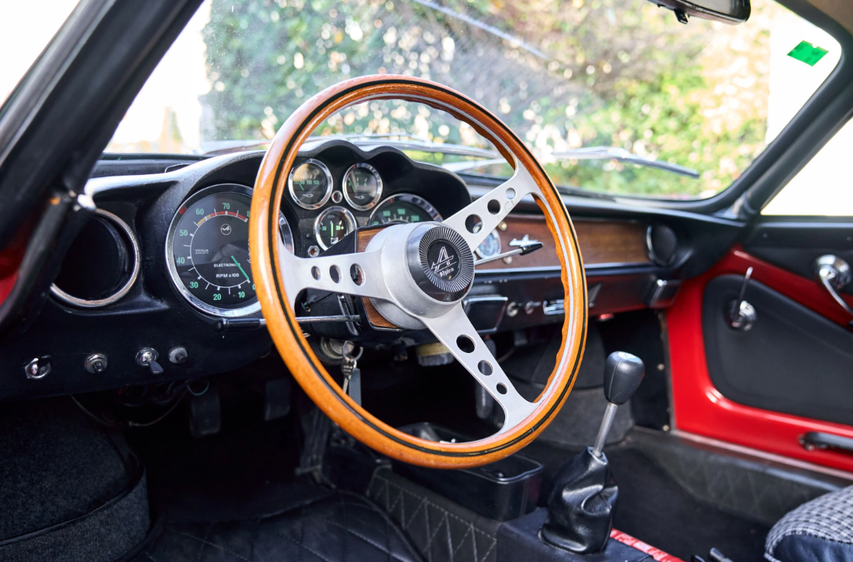 - Interior: Quilted upholstery with houndstooth cloth inserts, veneered dashboard, and a wood-rimmed sports steering wheel.