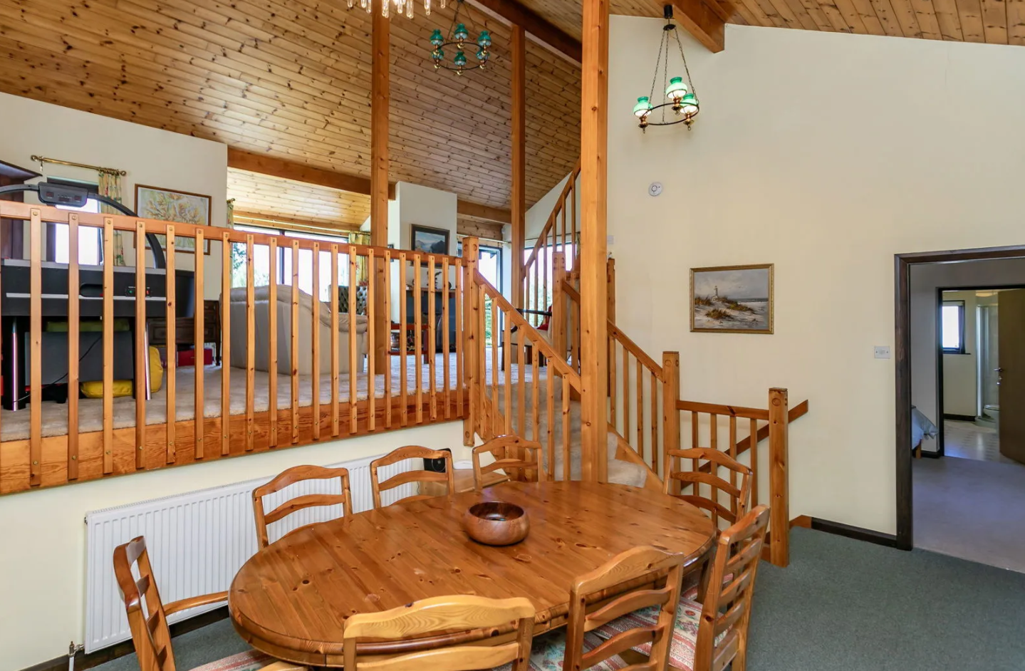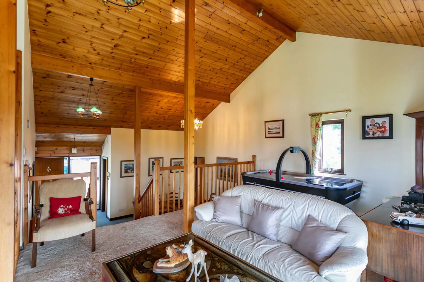 - Living Space: Open-plan design with a dramatic high-apex reception area, a mezzanine, and a wraparound glass-fronted balcony.