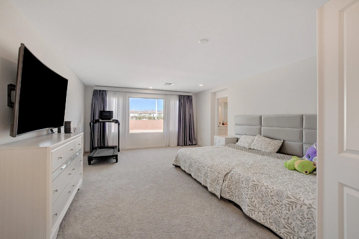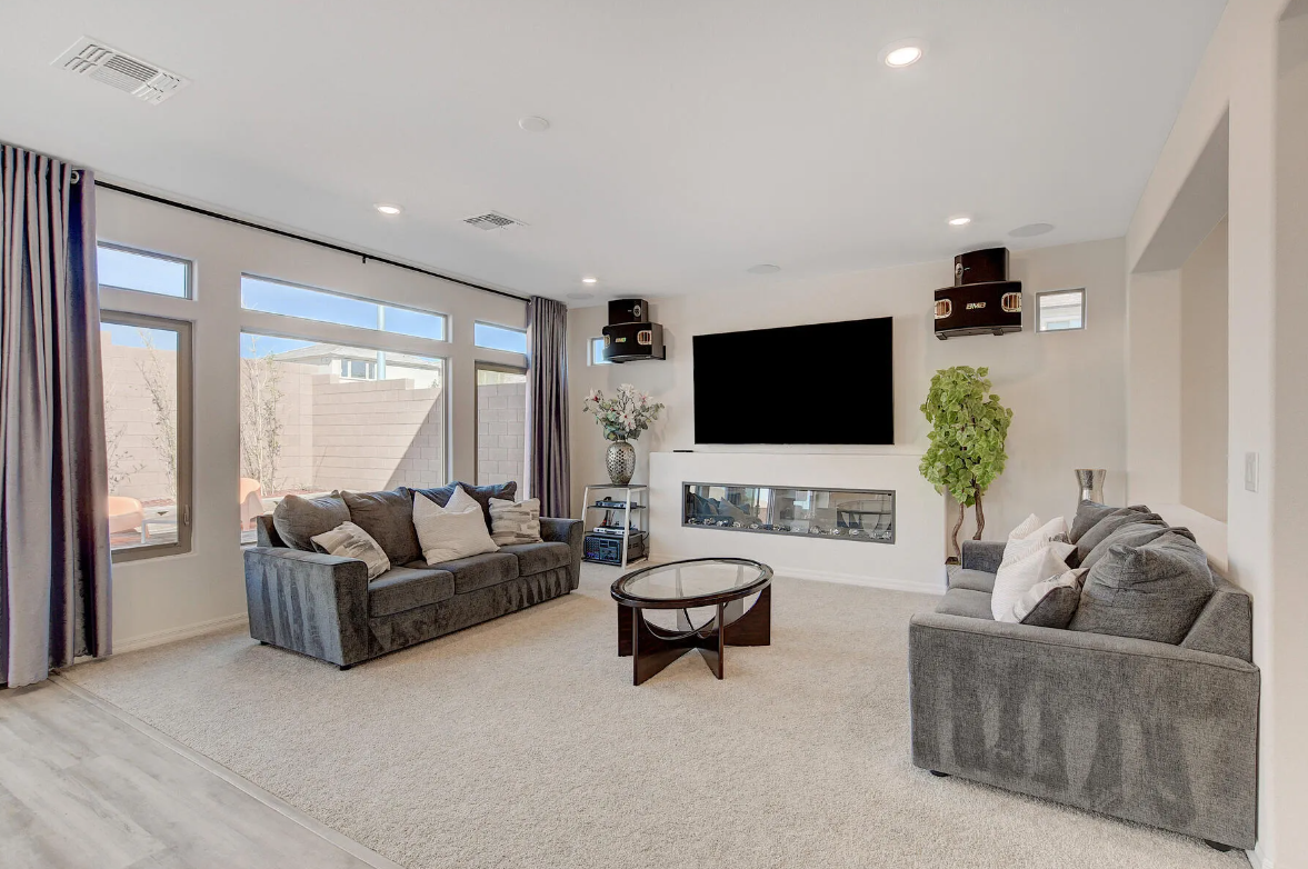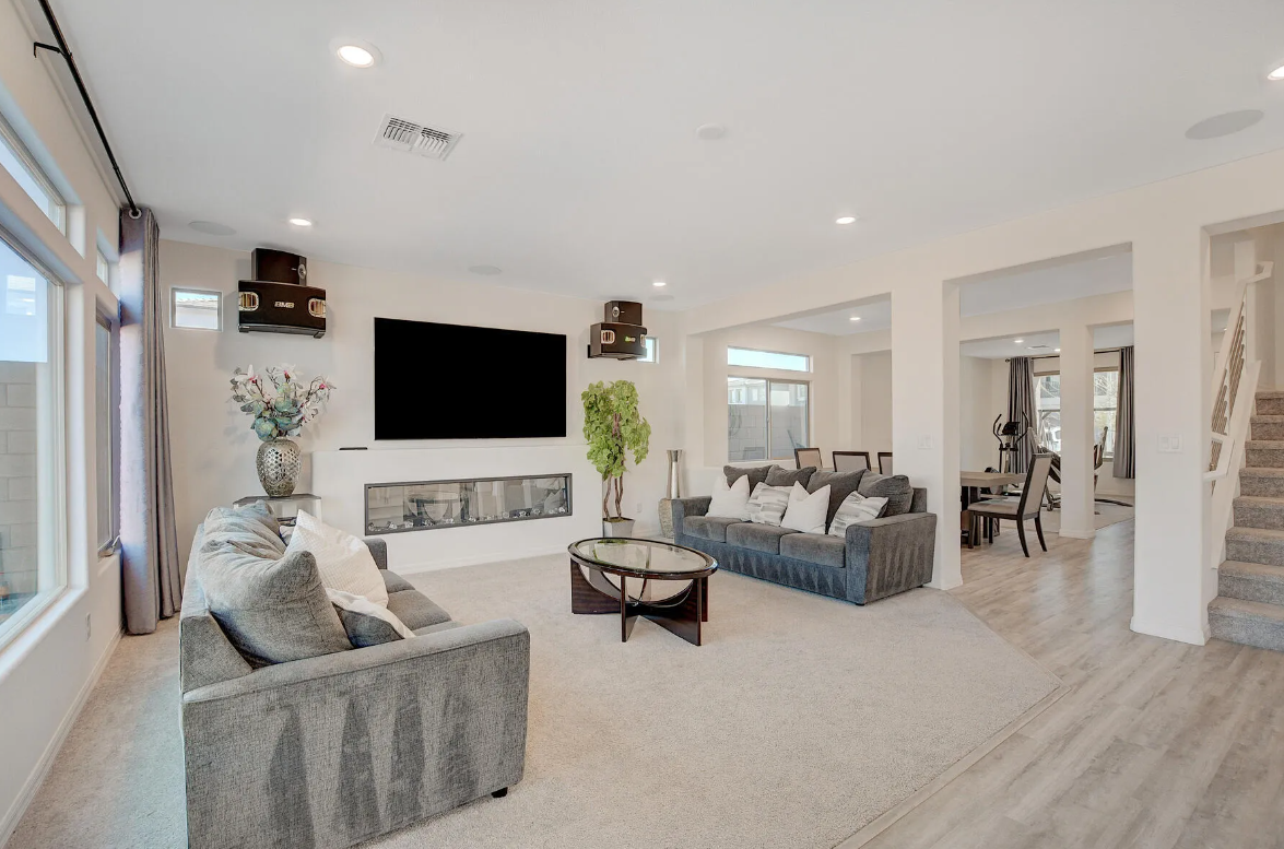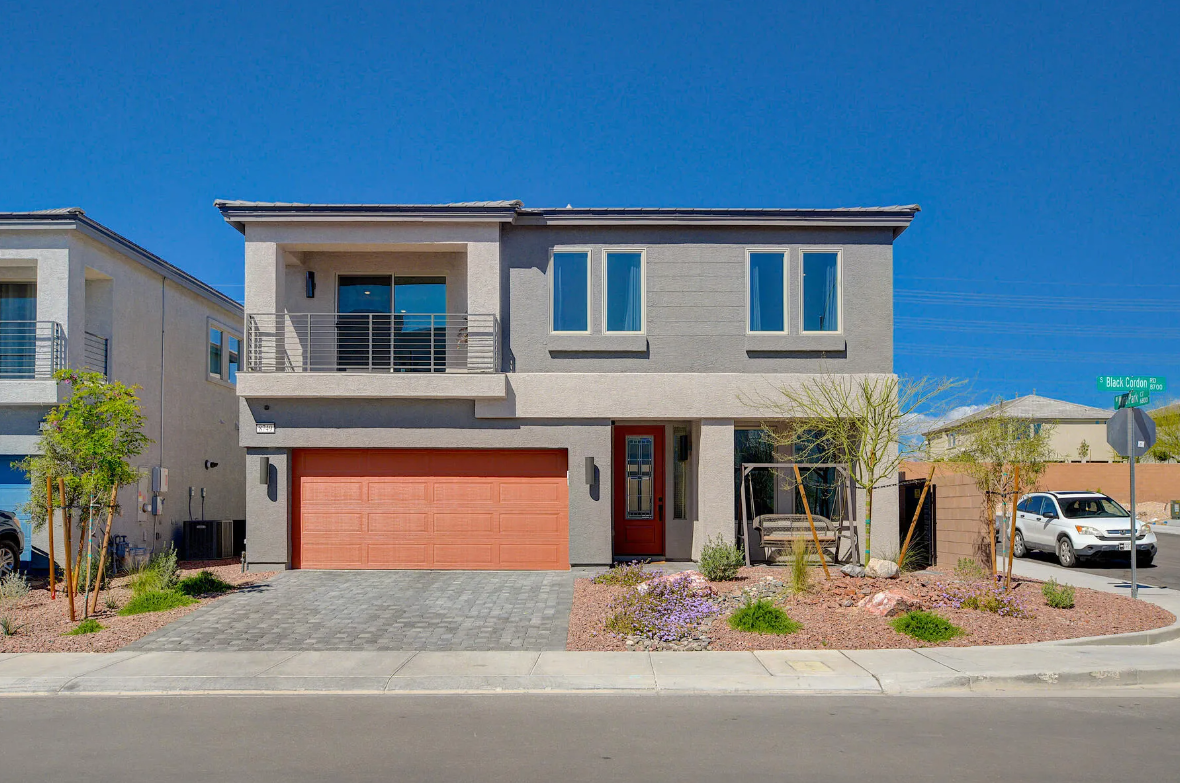 Modern 4-bedroom, 3.5-bath home in Las Vegas with dual master suites, gourmet kitchen, energy-efficient features, and luxury finishes. Open-concept living space, electric fireplace, surround sound, and pre-wired for EV charger.