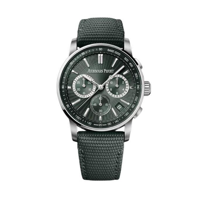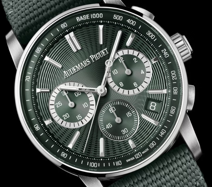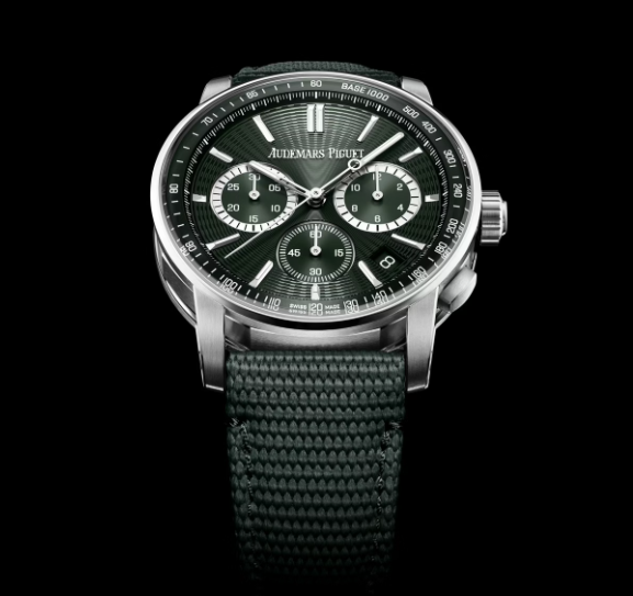 • Dial: Green with a contrasting rhodium-toned external zone and green counters, including a chronograph counter at 6 o’clock.