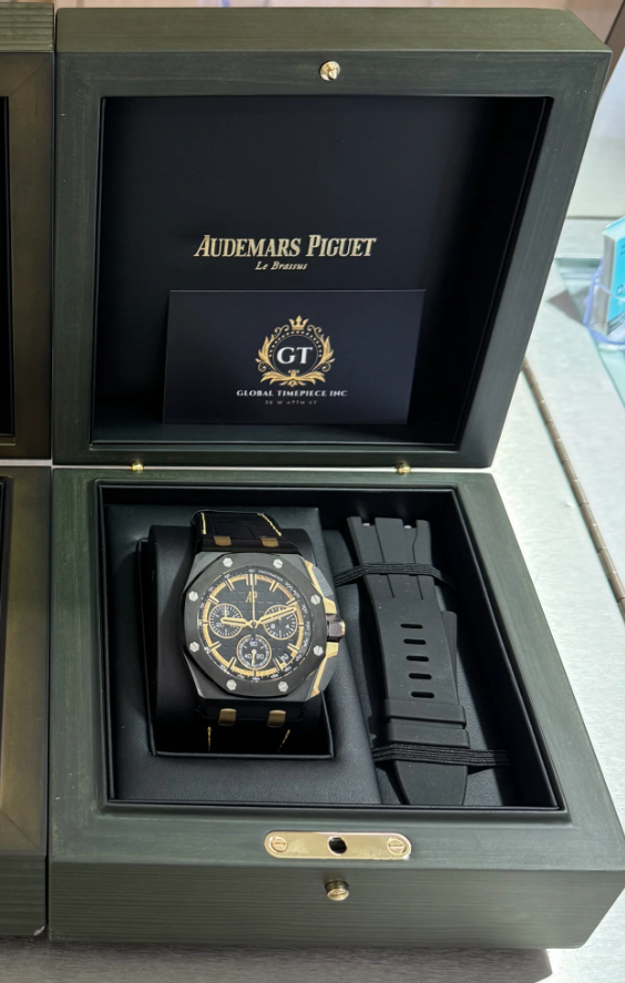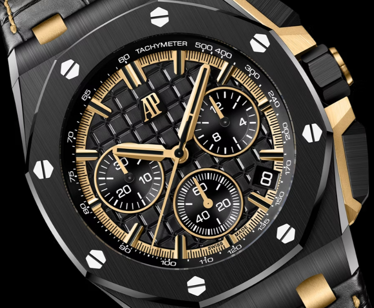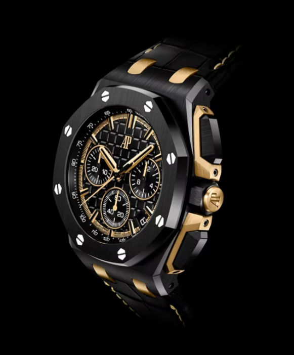 The Audemars Piguet Royal Oak Offshore Selfwinding Chronograph in black ceramic and yellow gold features a bold “Méga Tapisserie” dial, interchangeable straps, and 100m water resistance. A 43 mm case and 14.4 mm thickness highlight its refined yet sporty design.