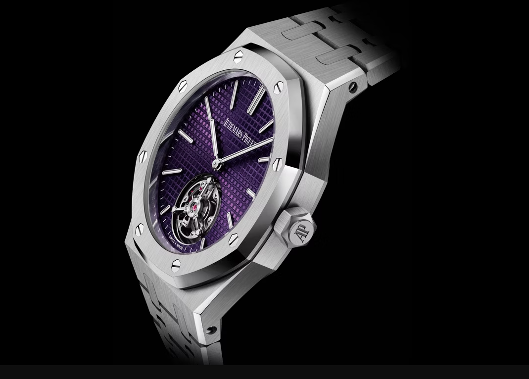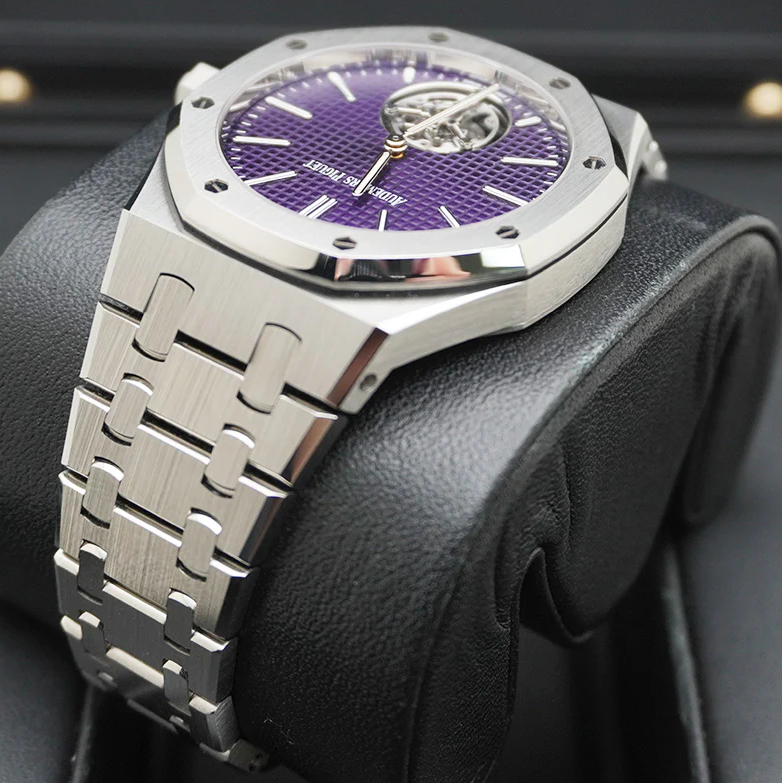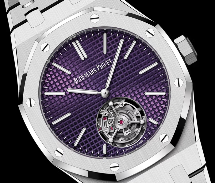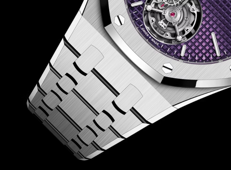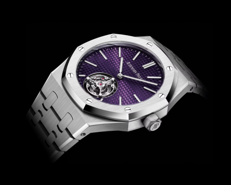- Dial: Plum “Petite Tapisserie” pattern dial, enriched with white gold applied hour markers and Royal Oak hands coated with luminescent material for improved visibility.