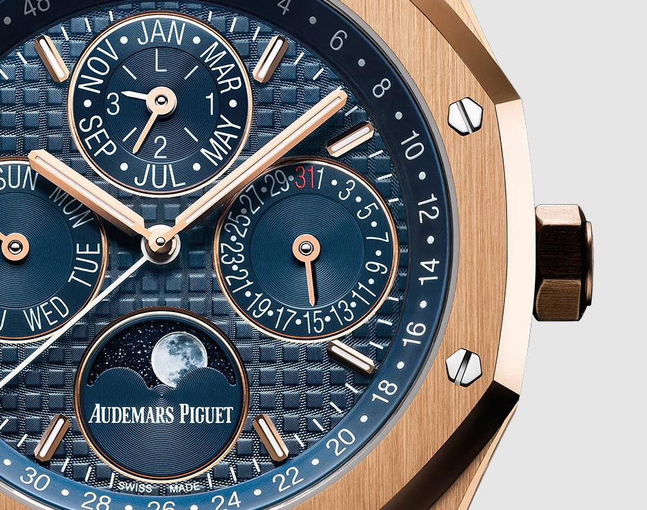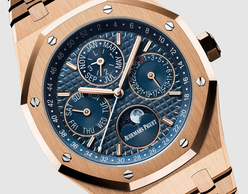 The Audemars Piguet Royal Oak Perpetual Calendar (Ref. 26574OR.OO.1220OR.02) combines 18-carat pink gold with a blue “Grande Tapisserie” dial, a perpetual calendar movement, and 20-meter water resistance, offering luxury, precision, and timeless design.