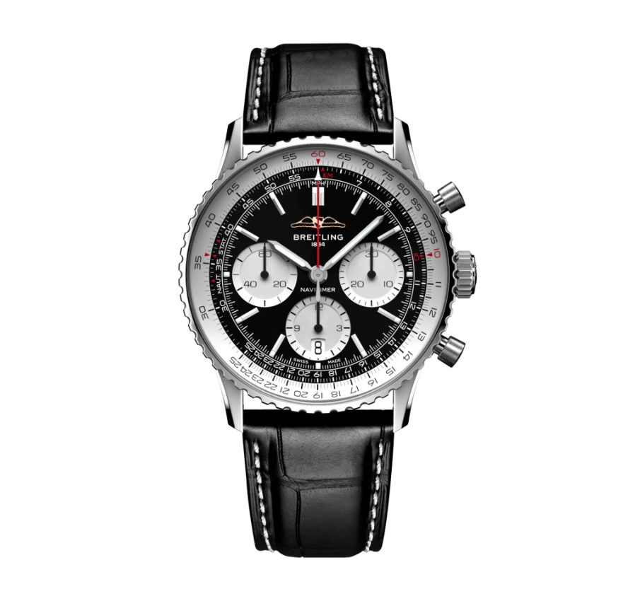 Breitling Navitimer B01 Chronograph 41 features a 41mm stainless steel case, self-winding movement with 70-hour power reserve, and a black alligator leather strap. Iconic slide rule bezel, sapphire crystal, and 3-bar water resistance make it a timeless pilot’s watch.