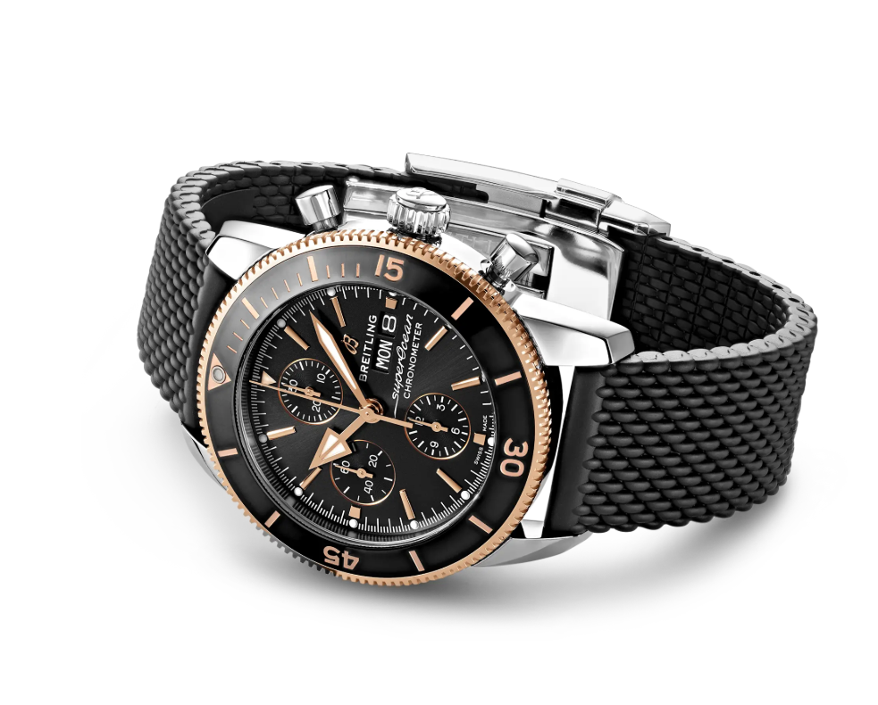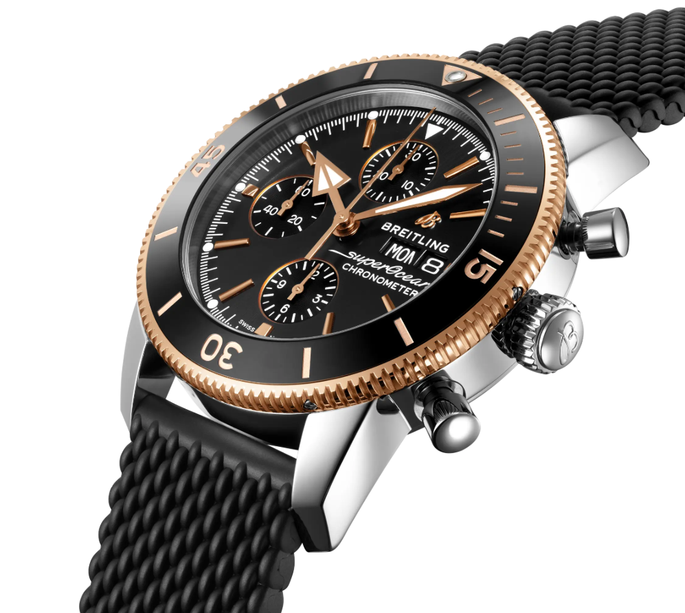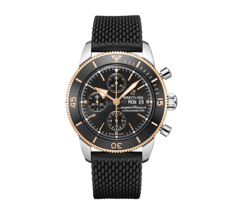 The Breitling Superocean Heritage Chronograph 44mm is a bold fusion of vintage-inspired design and modern chronograph performance. Crafted with a stainless steel and 18k red gold case, this luxurious dive watch combines sophisticated aesthetics with professional-grade functionality. Whether you’re exploring the depths of the ocean or making a statement on land, this precision-engineered timepiece ensures reliability, durability, and timeless style.