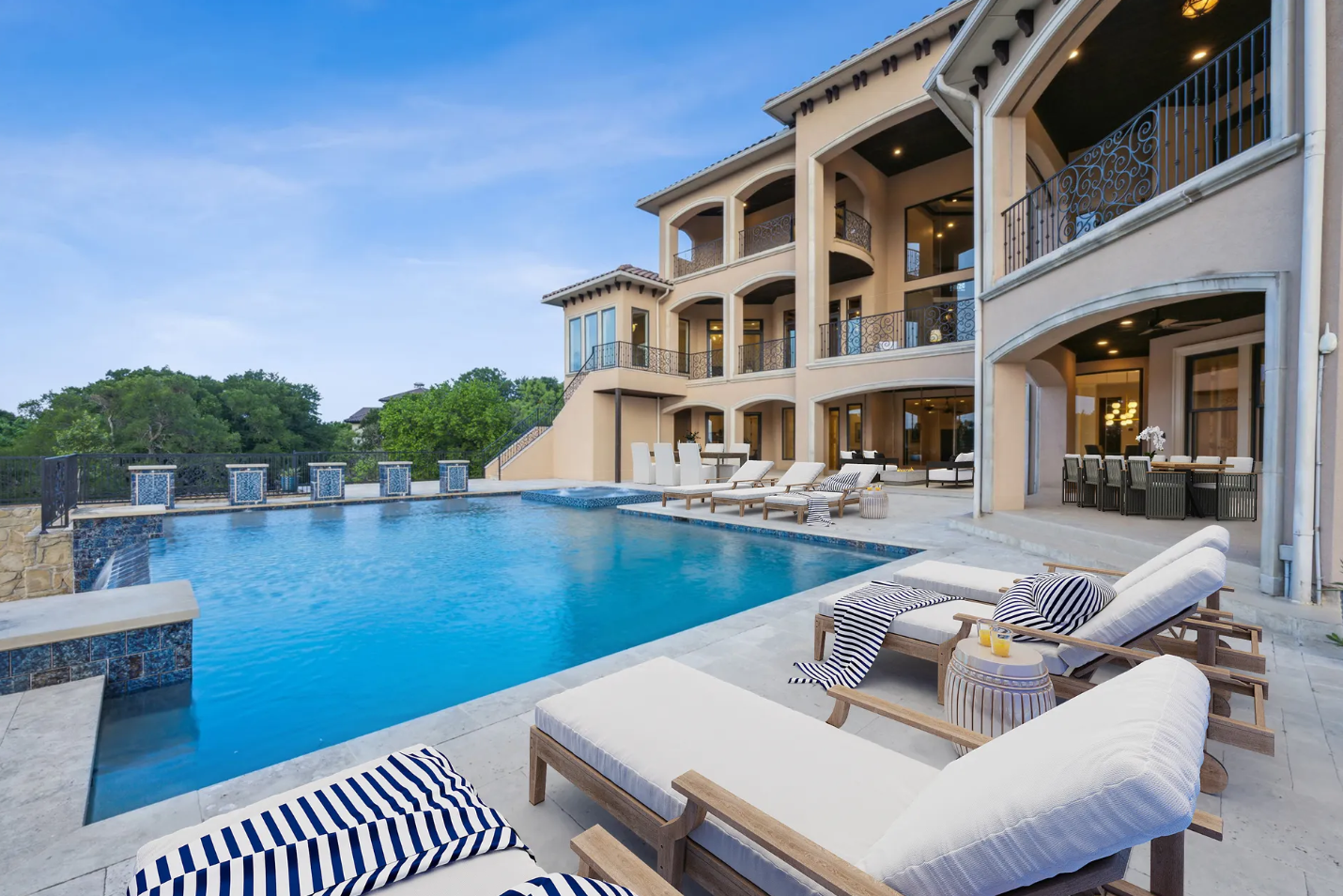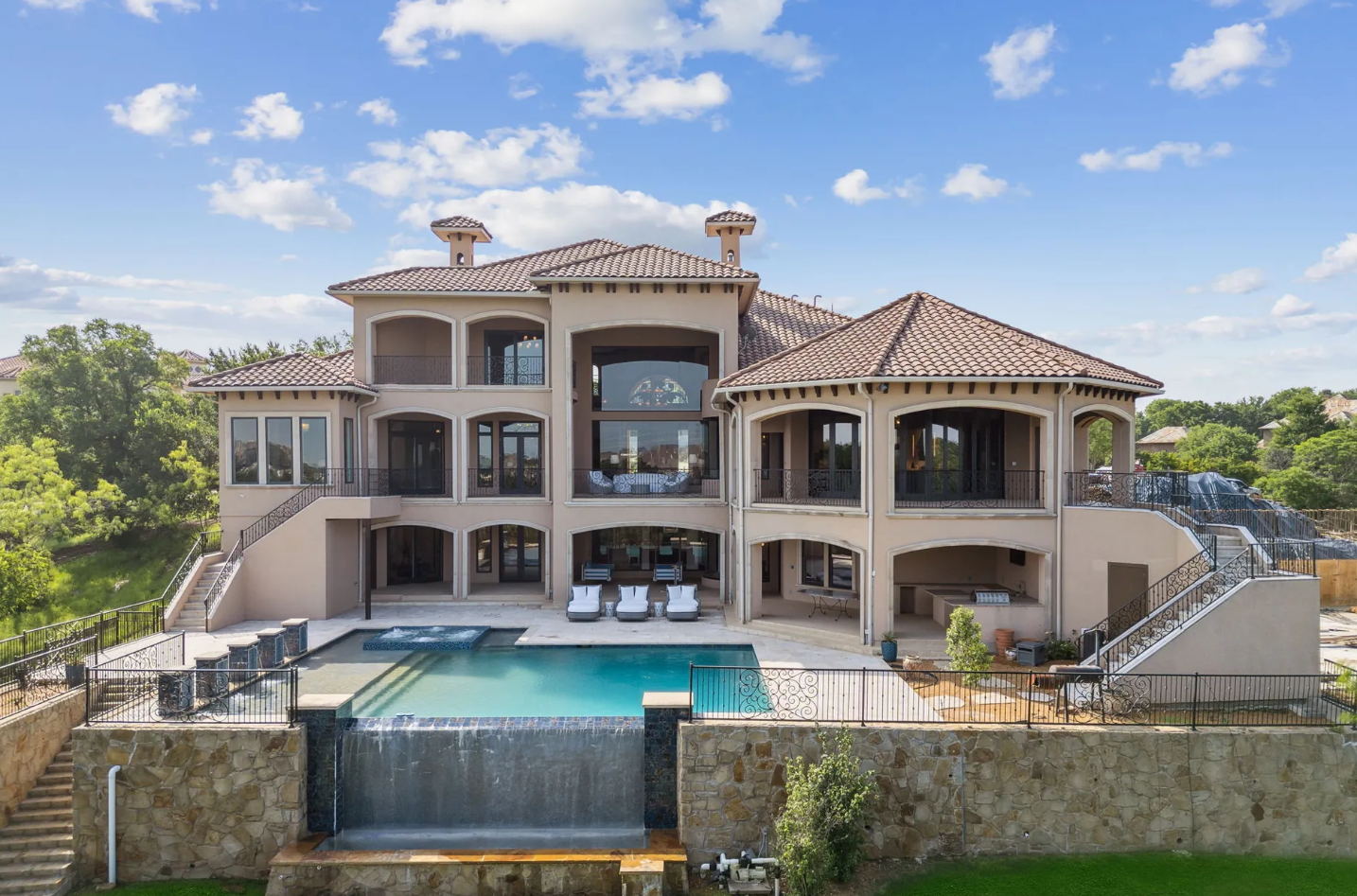 • Resort-style backyard with infinity pool and double-level patios.