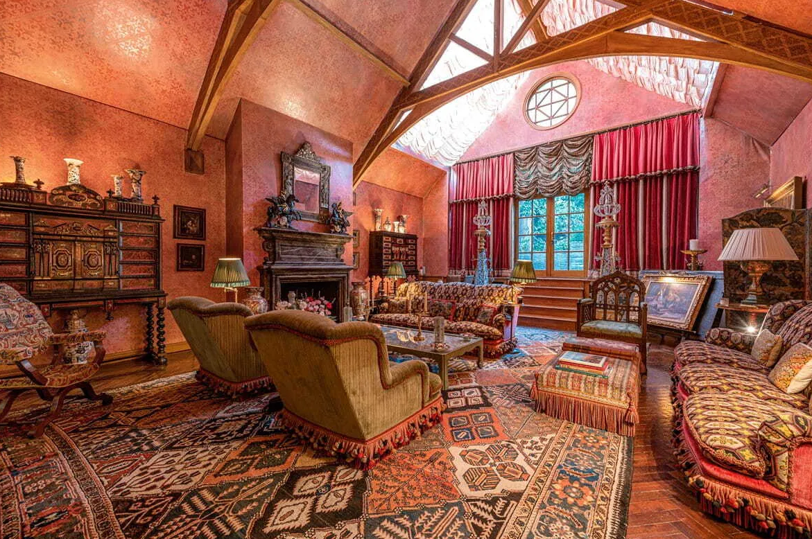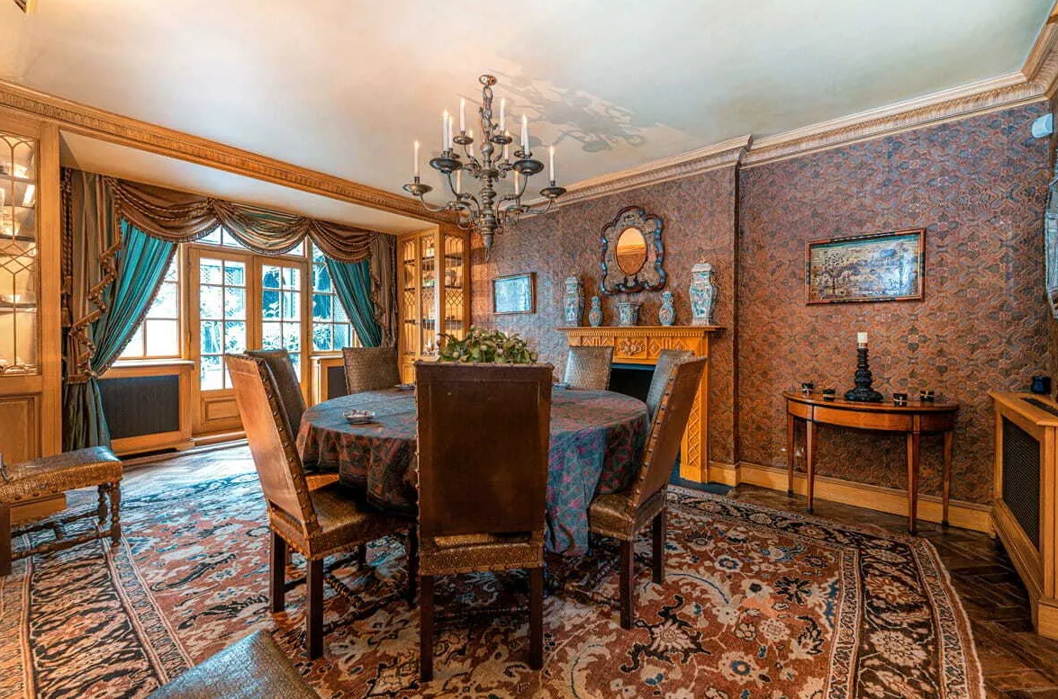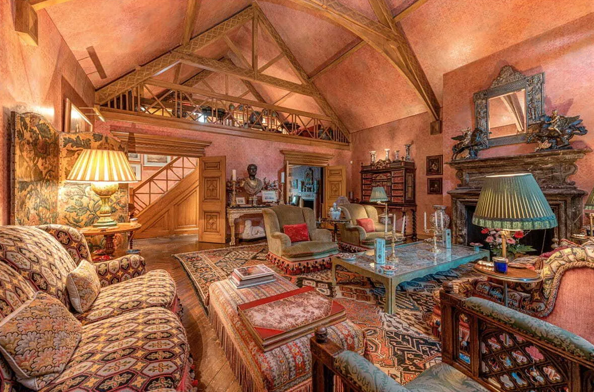 The house is filled with character, with original fireplaces in several rooms, two kitchens, and a formal dining area. A tranquil courtyard connects the various living spaces, while a cozy library on the mezzanine floor provides a quiet retreat.