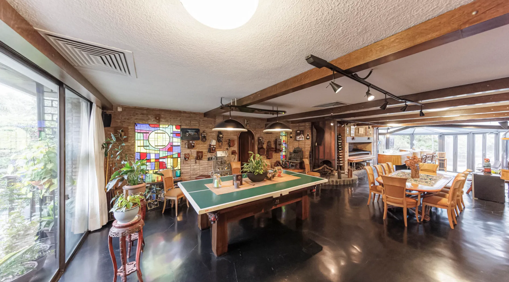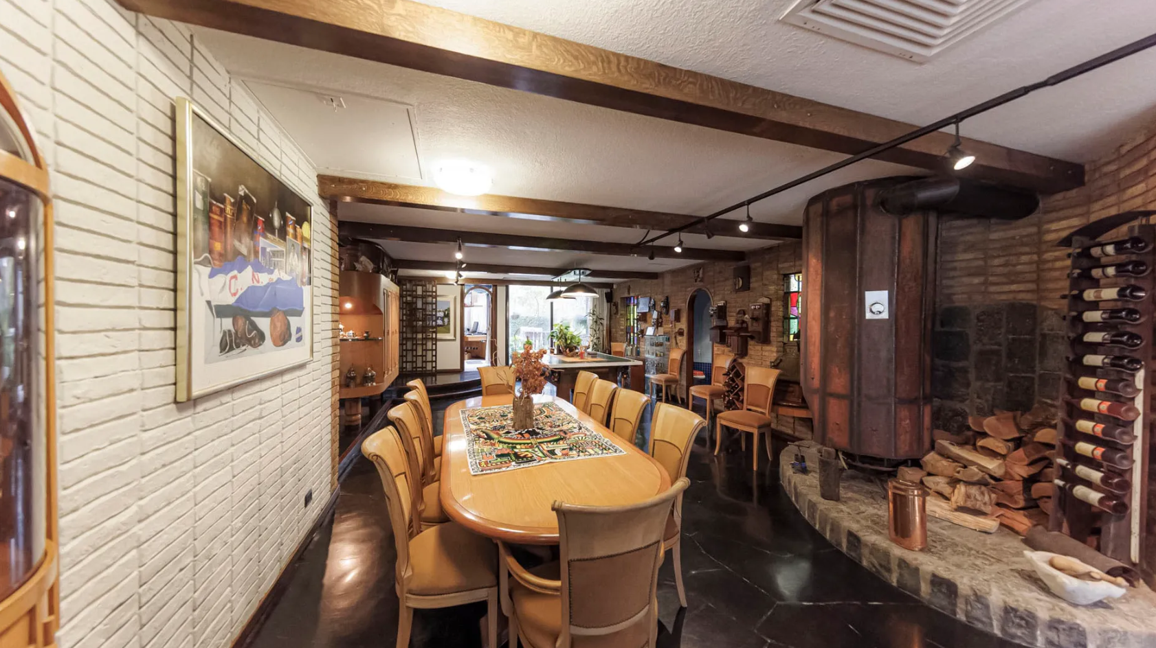 - Stone and brick structure with polished flagstone, tile, and pinewood floors.