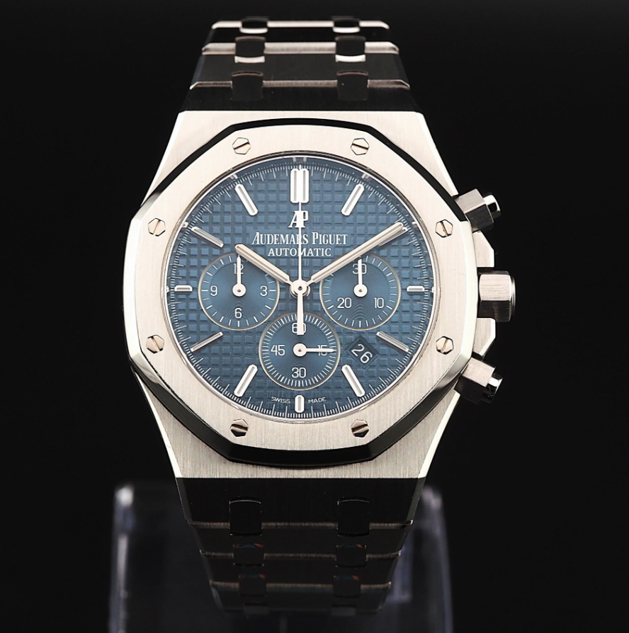 The Audemars Piguet Royal Oak Chronograph 41mm (Reference 26320ST.OO.1220ST.03) from 2016 is a remarkable blend of precision engineering and iconic design. This timepiece features the signature blue dial with the famous “Tapisserie” pattern, and is housed in a stainless steel case that measures 41mm in diameter, striking a perfect balance between elegance and practicality. Powered by the automatic AP 2385 movement, it offers impeccable chronograph functionality, making it not only a visually stunning watch but also an excellent tool for timing.