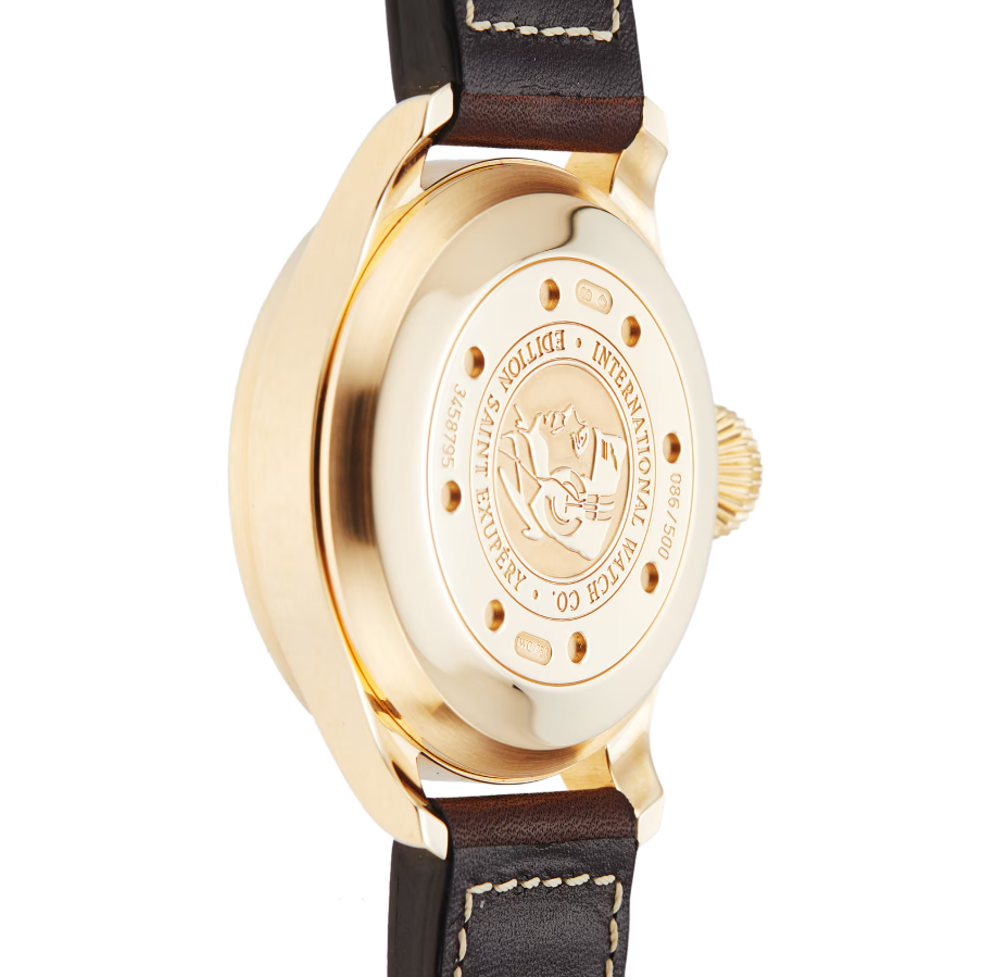 This limited-edition Big Pilot’s watch is an homage to Antoine De Saint Exupery, the celebrated author of The Little Prince. Its oversized crown, inspired by early aviation watches, ensures easy handling, while the power reserve indicator at 3 o’clock displays the impressive 168-hour reserve. The gold-plated Arabic numerals and hands, paired with the deep tobacco-brown dial, create a striking contrast that enhances legibility.