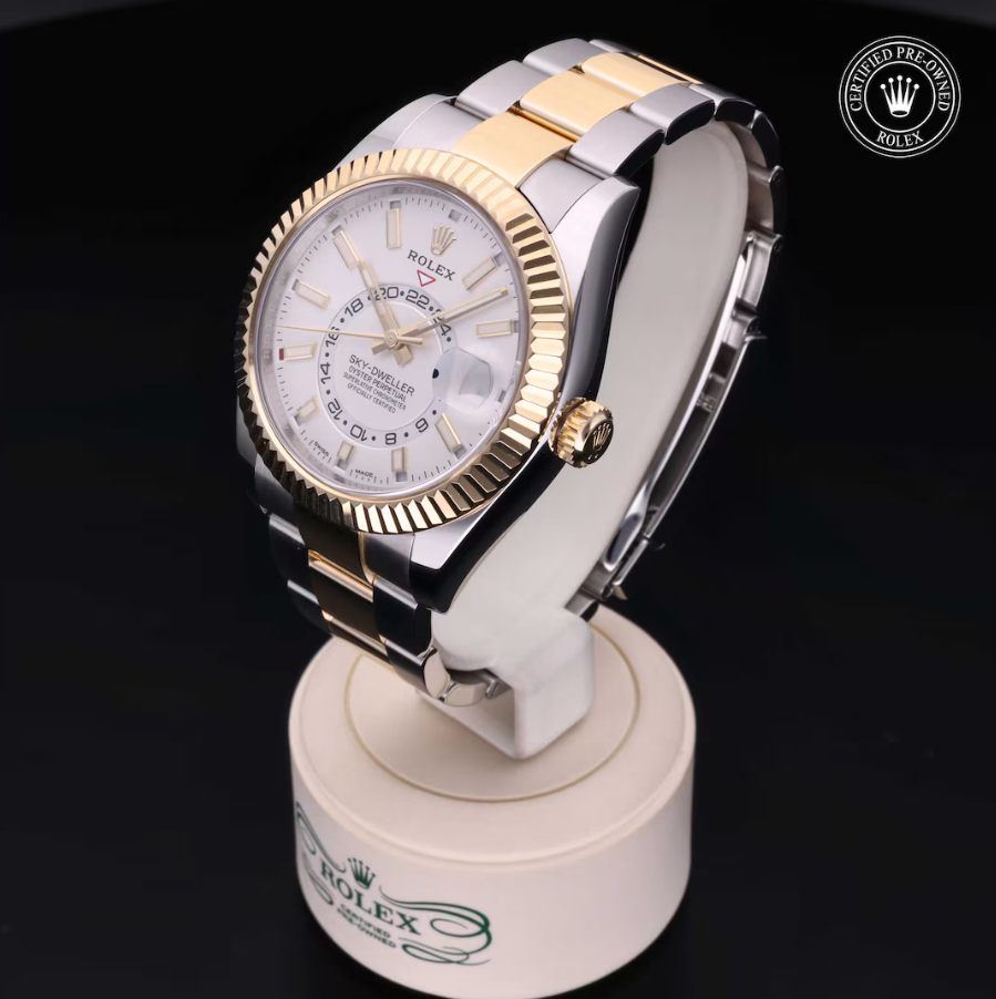 The Rolex Sky-Dweller Yellow Gold 326933 is an exquisite blend of advanced horology and timeless elegance, making it the ultimate luxury watch for global travelers. Designed for those who demand both style and functionality, this 2020 model features a 42mm case crafted from durable Oystersteel and 18k Yellow Gold, ensuring both resilience and sophistication. The stunning white dial, accented with luminous hour markers and an off-center 24-hour display, enhances legibility while maintaining a refined aesthetic.