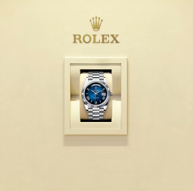 The Rolex Oyster Perpetual Day-Date 40 in platinum is an icon of luxury and precision. Exclusively crafted in 950 platinum, this exceptional timepiece is renowned for its fluted bezel, a striking blue ombré dial, and the prestigious President bracelet. A symbol of achievement and excellence, the Day-Date 40 combines Rolex’s unmatched craftsmanship with cutting-edge horology.