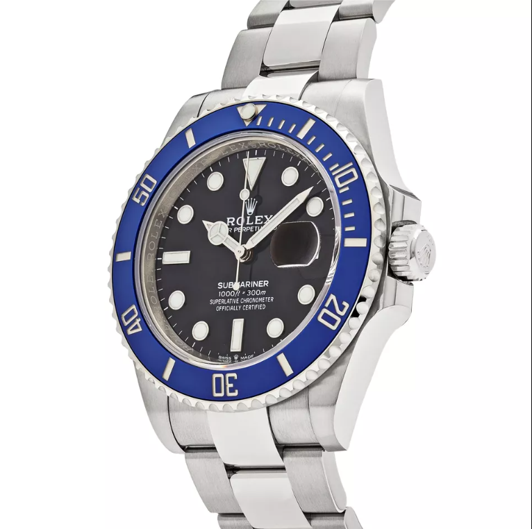The Rolex Submariner Date White Gold Blue Bezel Black Dial 41mm is a statement of refined strength, seamlessly combining deep-sea functionality with timeless elegance. The vibrant blue ceramic bezel contrasts beautifully with the sleek black dial, while Rolex’s superior craftsmanship ensures unparalleled performance. Whether diving into the depths of the ocean or attending a formal event, this Submariner is the perfect companion for those who demand the best in luxury and engineering.