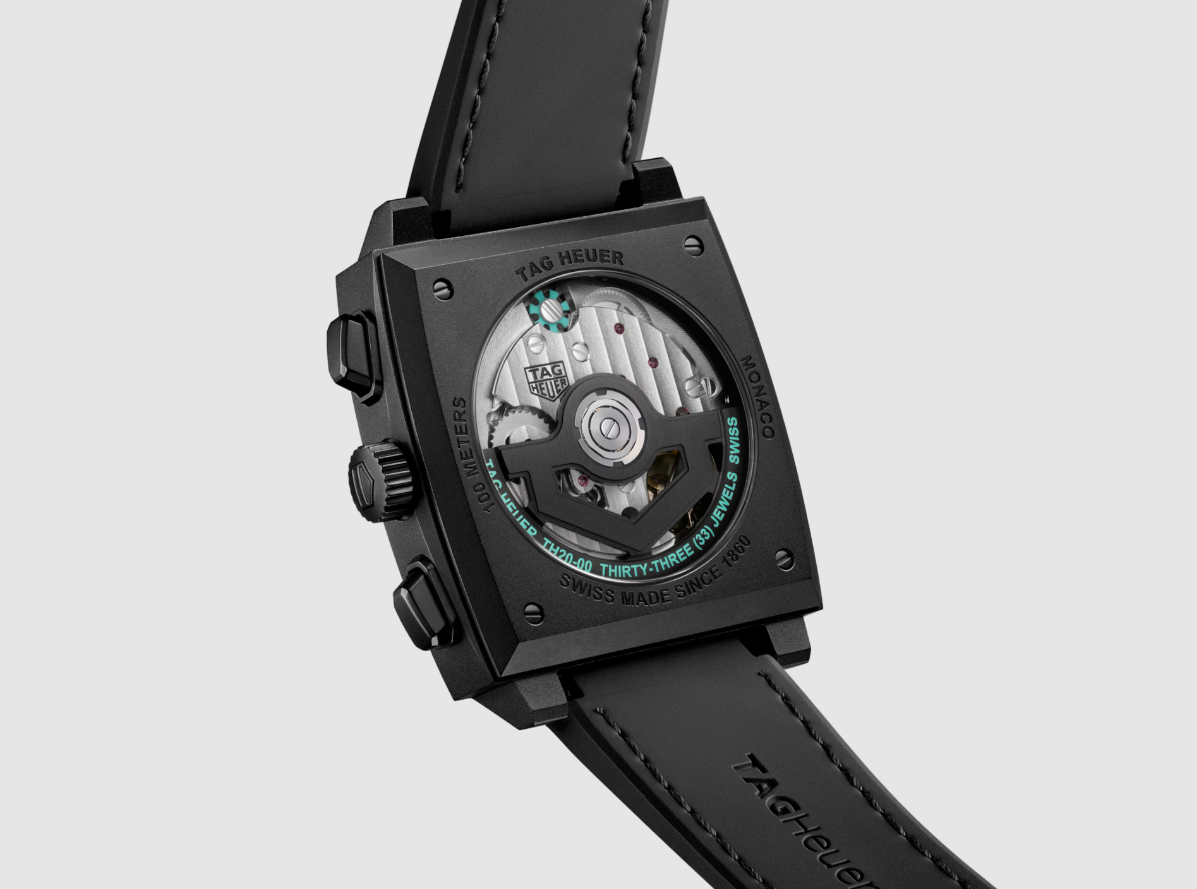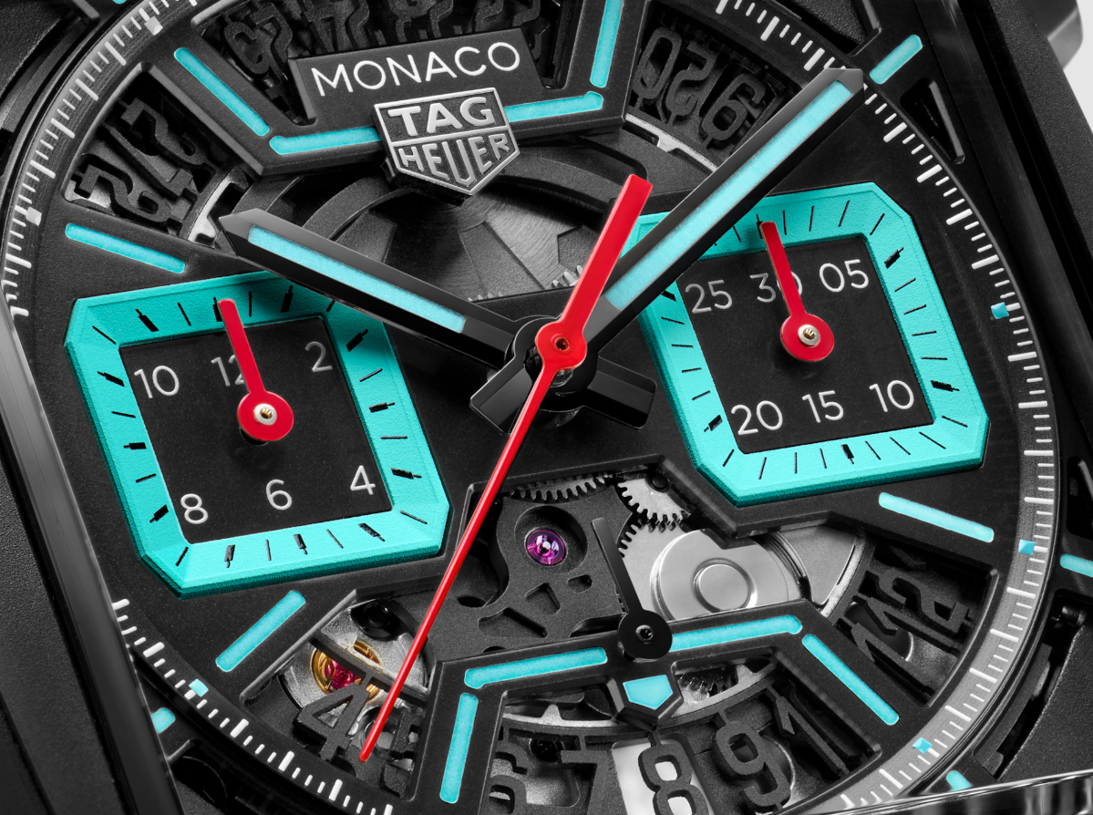 This 39mm TAG Heuer Monaco Chronograph features a bold DLC titanium case with a black opalin dial and turquoise highlights. Powered by the Caliber Heuer 02 automatic movement with 80 hours of power reserve. Water-resistant up to 100m.