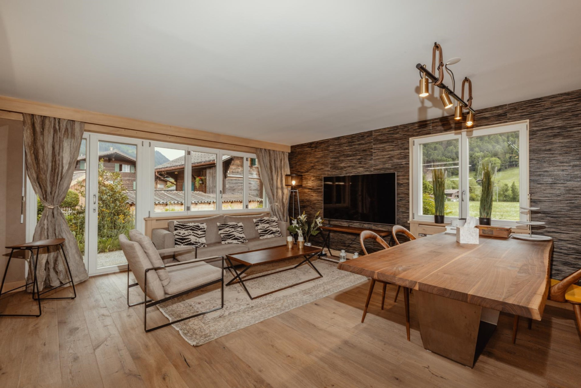 Discover an exceptional opportunity to own a sophisticated garden-level apartment in the heart of Gstaad, Switzerland. This modern 3-bedroom residence seamlessly blends elegant interiors with stunning alpine surroundings, making it an ideal second home or vacation retreat.