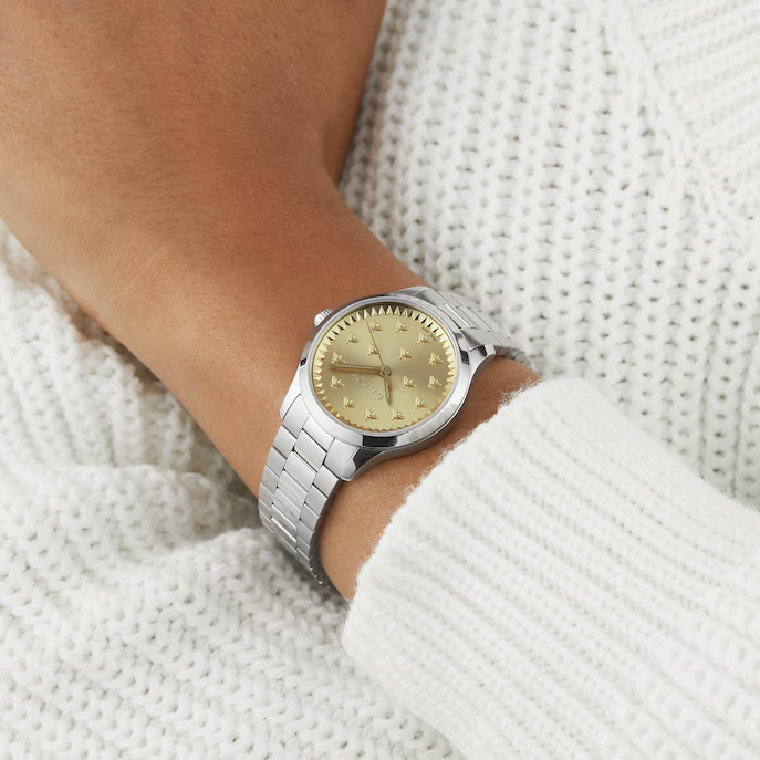 - Dial: Radiant gold finish, enhanced with Gucci’s signature bee motif for a distinctive aesthetic.