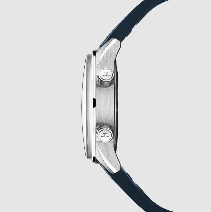 Jaeger-LeCoultre Polaris Date: A 42mm stainless steel watch with a blue lacquered dial, skeletonized hands, and 70-hour power reserve. Features automatic movement, water resistance to 20 bar, and interchangeable blue rubber strap with “Clous de Paris” pattern.