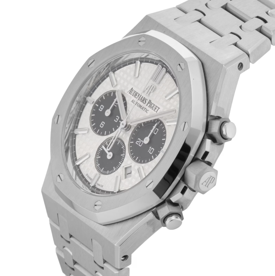The Royal Oak Chronograph stands out with its classic octagonal bezel, secured by signature hexagonal screws, delivering a bold yet refined presence. The white dial, enhanced by the Grande Tapisserie pattern, adds depth and elegance. Subdials at 3, 6, and 9 o’clock provide precise chronograph functionality while maintaining balance in design.