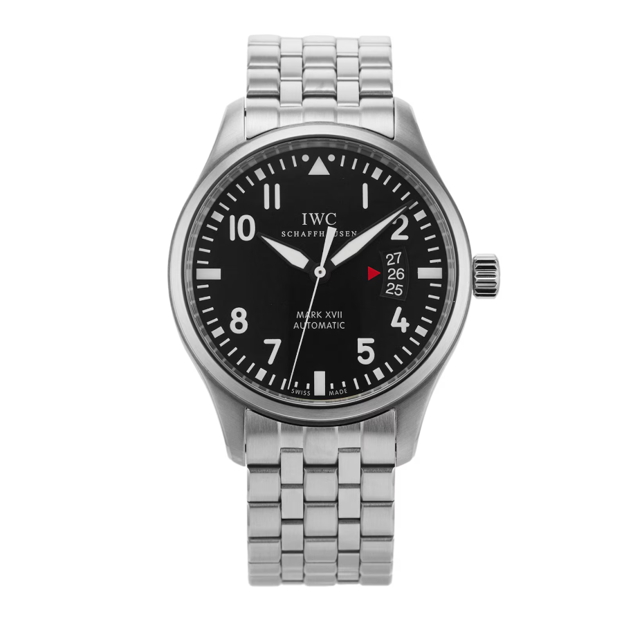Pre-Owned IWC Pilot’s Watch Mark XVII IW326504, 41mm stainless steel case, black dial, automatic movement, sapphire crystal, water-resistant to 60m. Includes inner box, papers, and stainless steel bracelet. Very good condition.