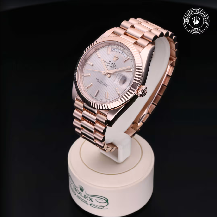 The Day-Date 40 is crafted from 18ct Everose Gold, giving it a sophisticated and timeless appeal. The Sundust dial captures and reflects light beautifully, creating a striking look. The Fluted bezel complements the watch’s luxurious feel, while the President bracelet ensures a comfortable fit for any wrist.
