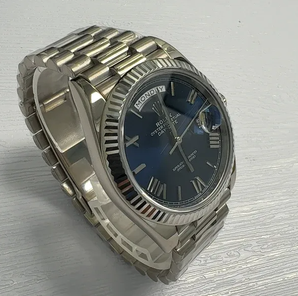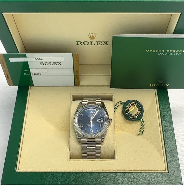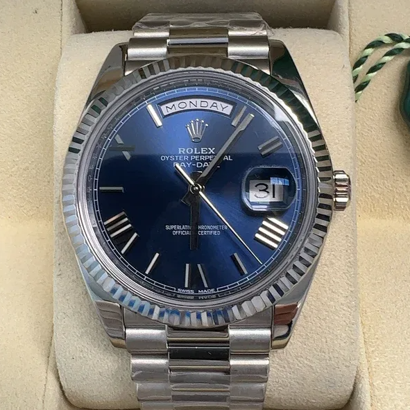 The Rolex Day-Date 40 in 18k White Gold with a Fluted Bezel, Blue Roman Dial, and Automatic Caliber 3255 movement offers the perfect combination of luxury and style. Released in 2015, this timepiece continues to be a favorite among collectors for its refined design and impeccable craftsmanship.