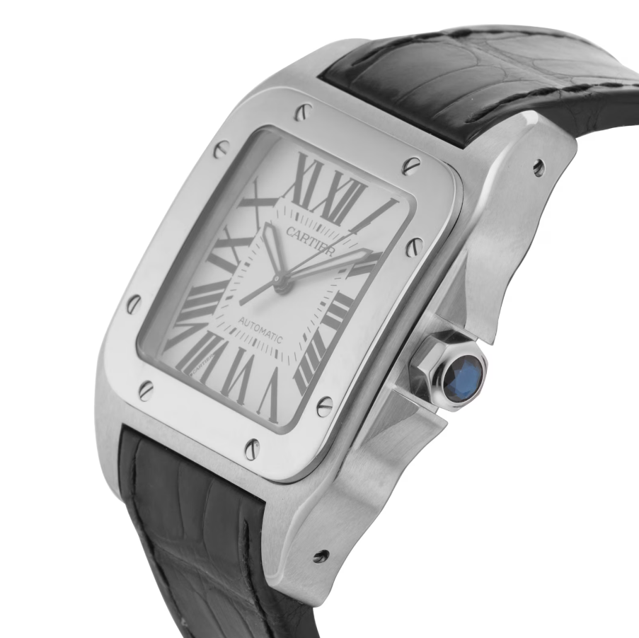 The Cartier Santos 100 stands out with its stainless steel case, which strikes the perfect balance between strength and elegance. The silver dial is enhanced by Roman numerals, creating a sophisticated aesthetic that never goes out of style. Thanks to the quartz movement, this timepiece guarantees precise timekeeping, offering both reliability and minimal maintenance.