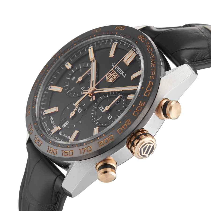 The TAG Heuer Carrera 44mm CBN2A5A.FC6481 is a sophisticated timepiece that effortlessly blends performance with luxury. Designed for men who appreciate precision and style, this watch features a 44mm stainless steel case with ceramic and rose gold accents, creating a timeless and refined aesthetic. The black dial, protected by durable sapphire crystal glass, ensures clear readability and protects the watch from scratches, while the automatic movement offers exceptional reliability. Whether you’re a collector or a first-time buyer, this Carrera model is a perfect choice.