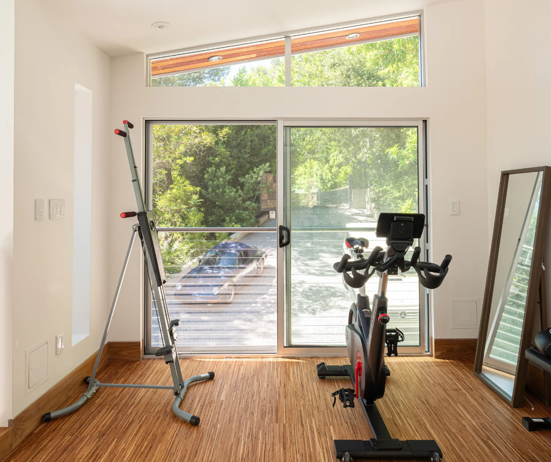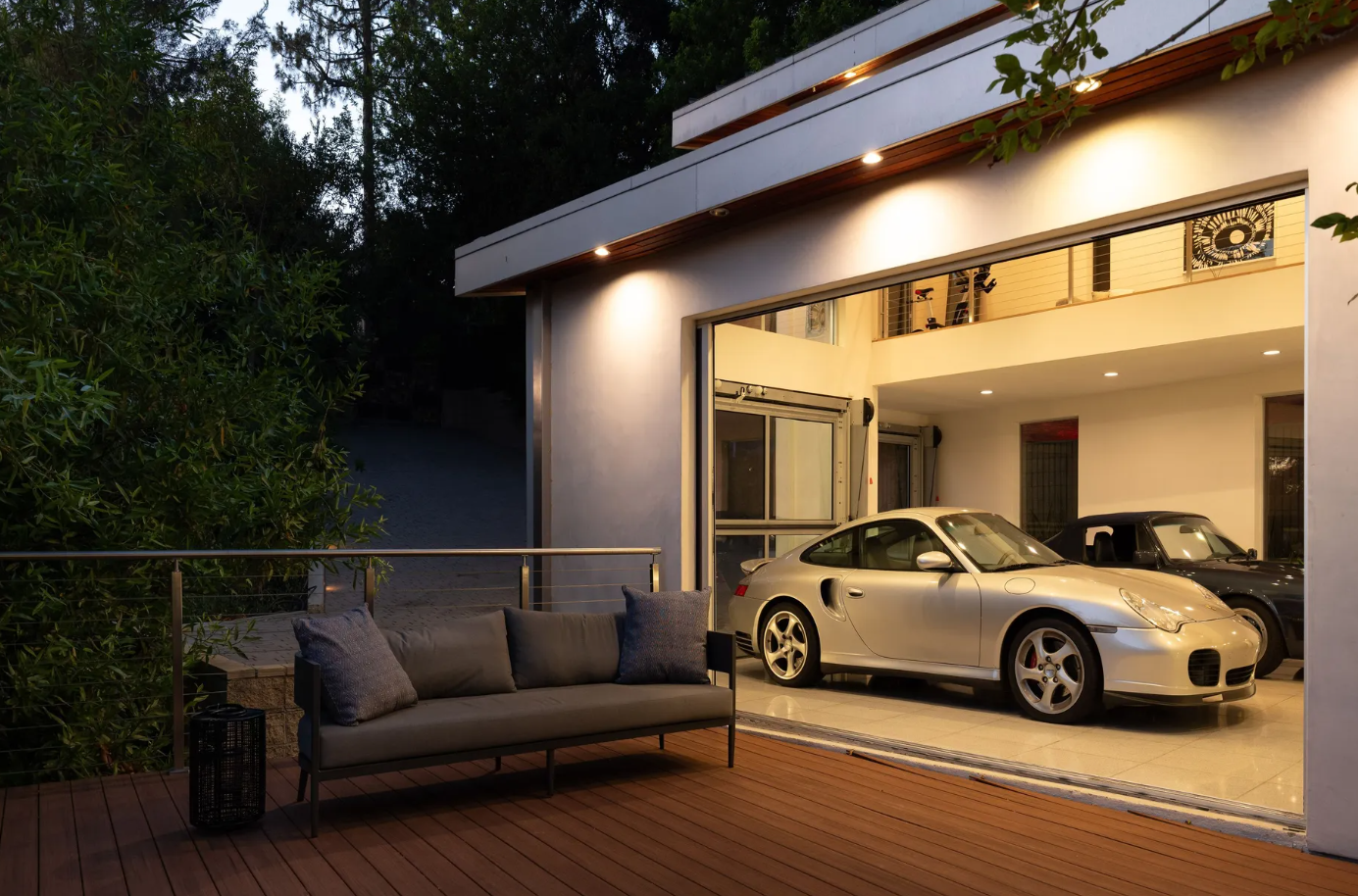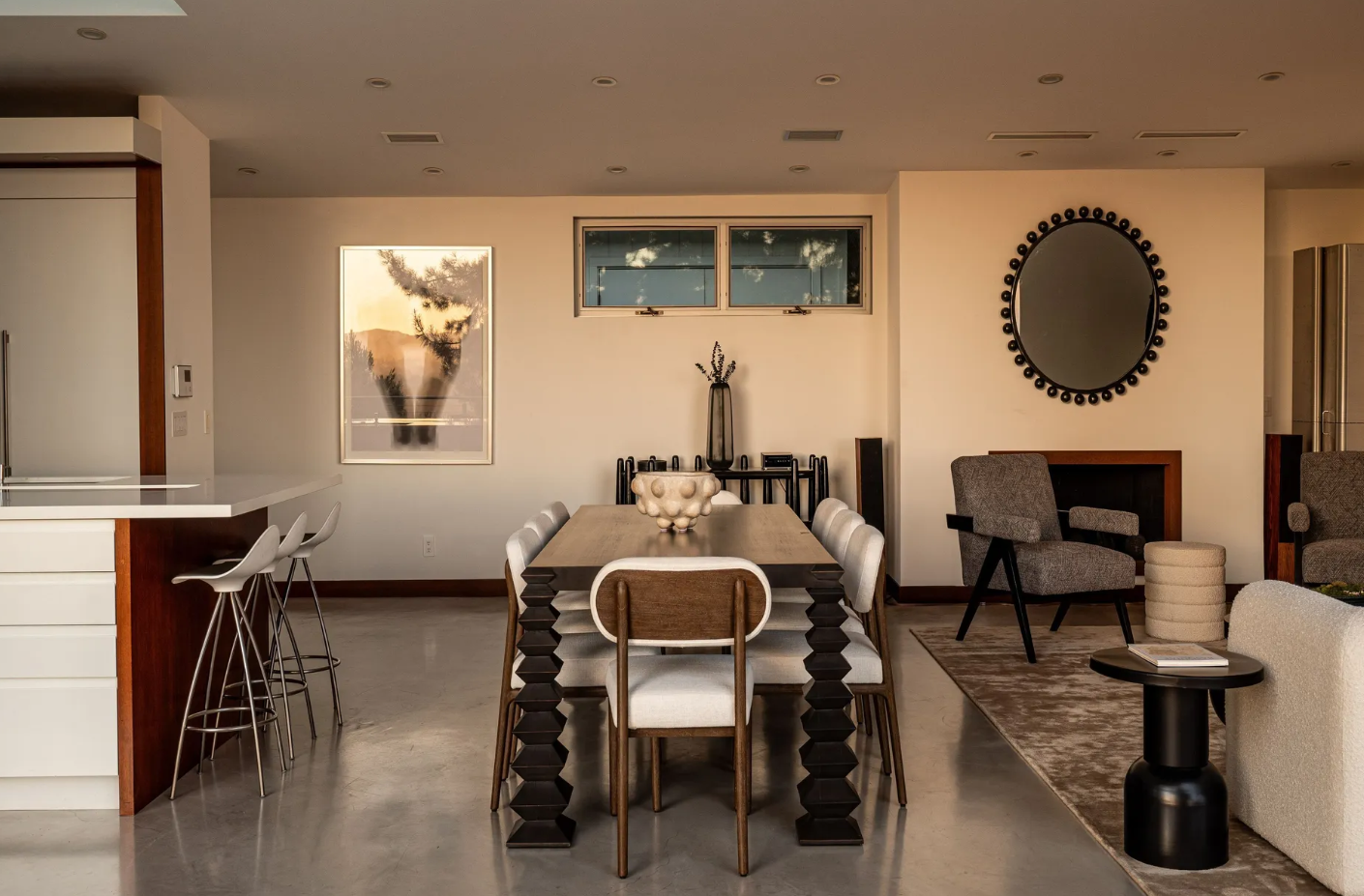 - Living Area: Gourmet kitchen, dining, living room with industrial fireplace, and retractable glass walls that lead to the outdoors