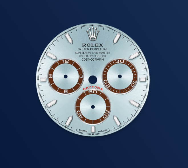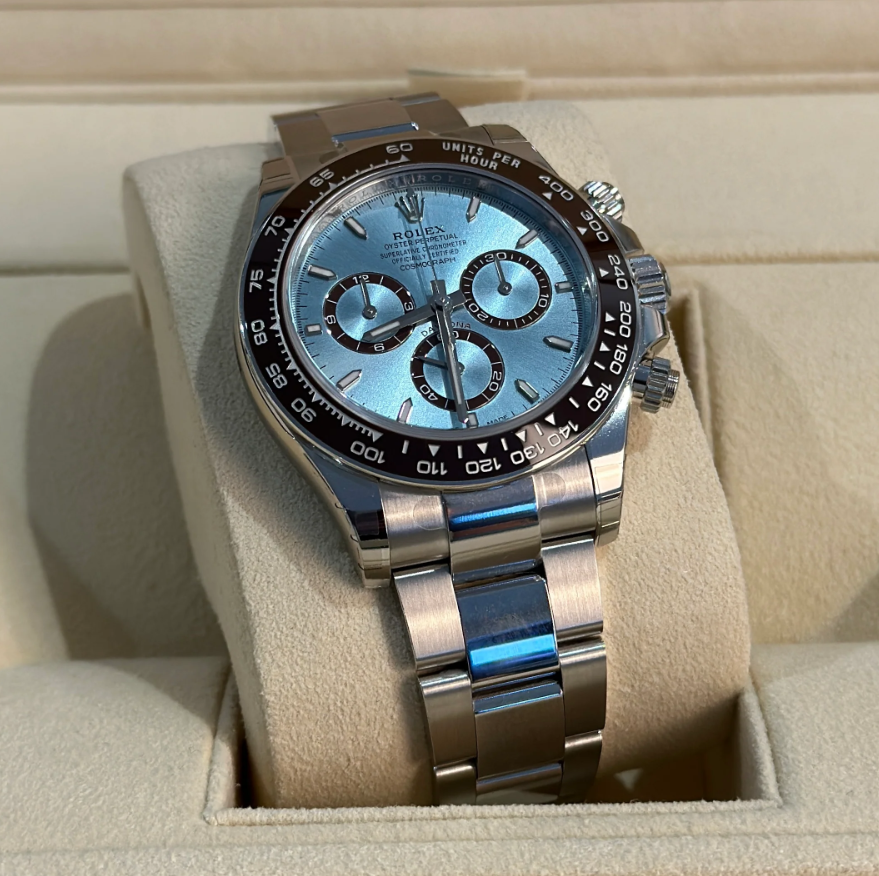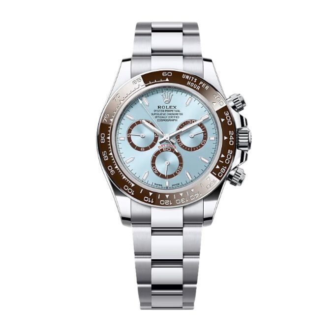 The Rolex Cosmograph Daytona in platinum is a high-performance chronograph that embodies the ultimate in luxury and precision. Featuring a striking ice-blue dial, chestnut brown Cerachrom bezel, and the robust Oyster bracelet, this model is a perfect blend of elegance and engineering. The tachymetric scale on the bezel enables precise speed measurements, while the platinum case ensures a timeless, luxurious look and feel.