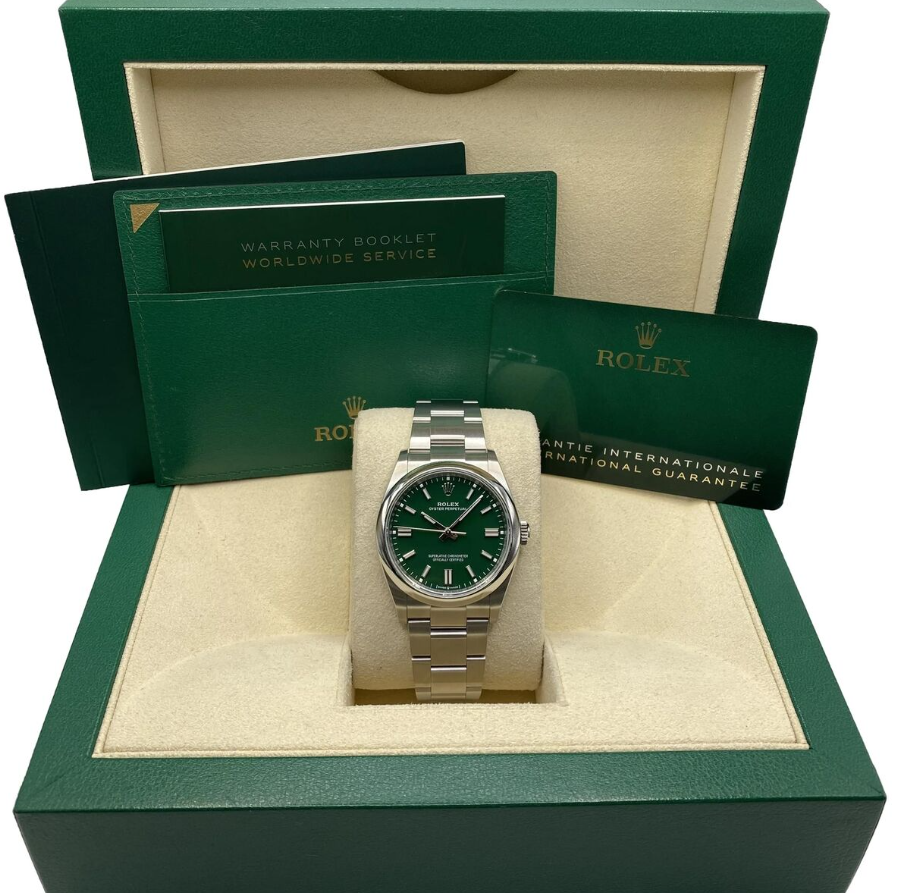 The Rolex Oyster Perpetual 36 with its striking green dial is a perfect balance of sophistication and cutting-edge technology. Designed for those who appreciate bold aesthetics and precision craftsmanship, this timepiece features a corrosion-resistant Oystersteel case, a domed bezel, and a durable Oyster bracelet. Its advanced movement ensures exceptional reliability, making it an enduring addition to any collection.