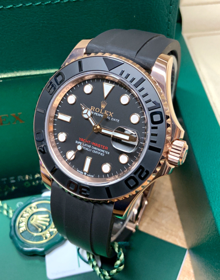 The Rolex Yacht-Master 40 is an elegant yet sporty timepiece with a 40mm Oyster case in 18kt Everose gold. This model features an intense black dial and the innovative Oysterflex bracelet, combining luxury with durability for the discerning watch enthusiast.